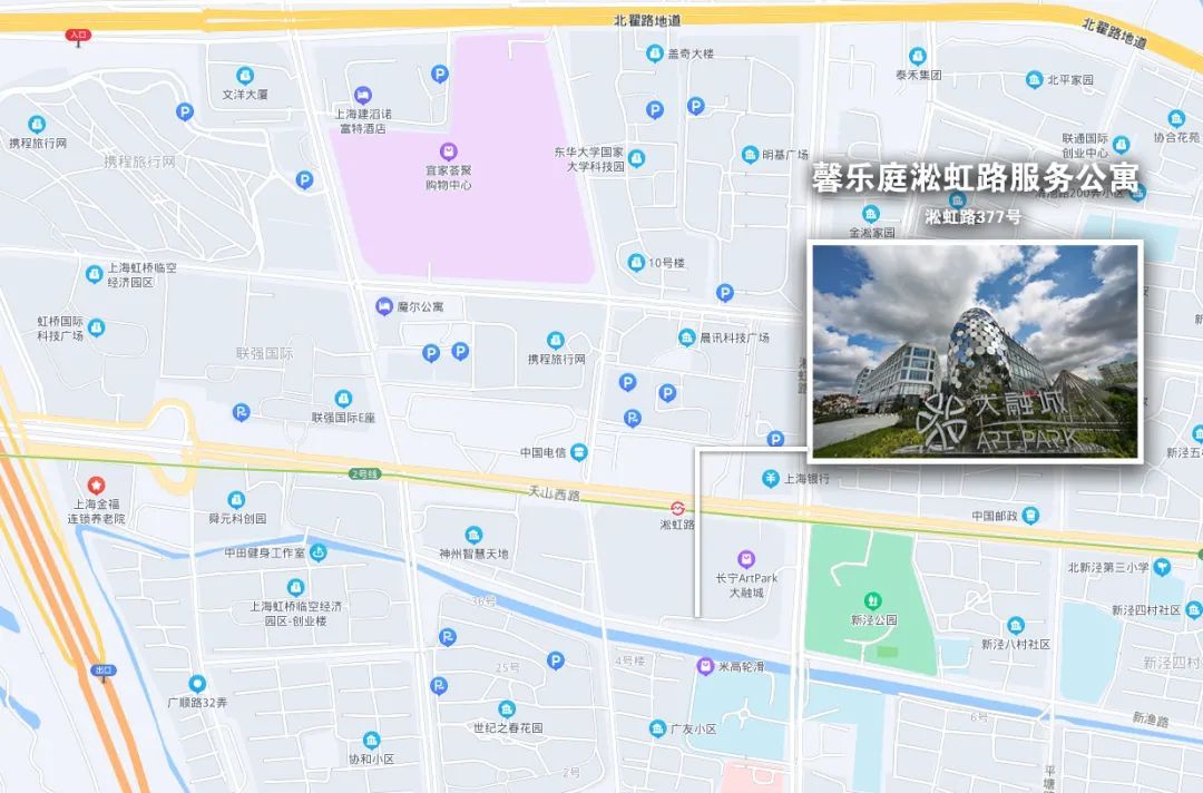 上海馨乐庭淞虹路服务公寓是长宁区首个商办用地配建租赁住房,坐落于园区的长宁Art Park大融城内,毗邻新泾公园和在建的上海荟聚(购物中心)等生活及商业配套设施,与地铁2号线淞虹路站无缝连接,地理位置优越,交通出行也十分便利。