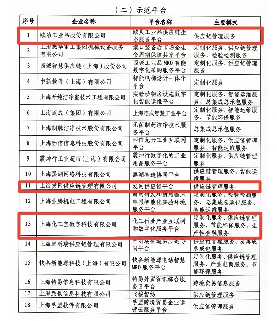 近日,上海市经济和信息化委员会正式公布上海市第四批服务型制造示范名单,认可和推广在推动制造业提质增效和转型升级、促进服务型制造高质量发展方面的一批服务型制造示范标杆。全市共有14家示范企业、18个示范平台和2个示范项目入选,宝山的3家企业欧冶工业品股份有限公司、上海发网供应链管理有限公司和上海化工宝数字科技有限公司分别凭借“欧贝工业品供应链生态服务平台”“发网供应链平台”和“化工行业产业互联网和数字化服务平台”,成功入选上海市第四批服务型制造示范平台名单。