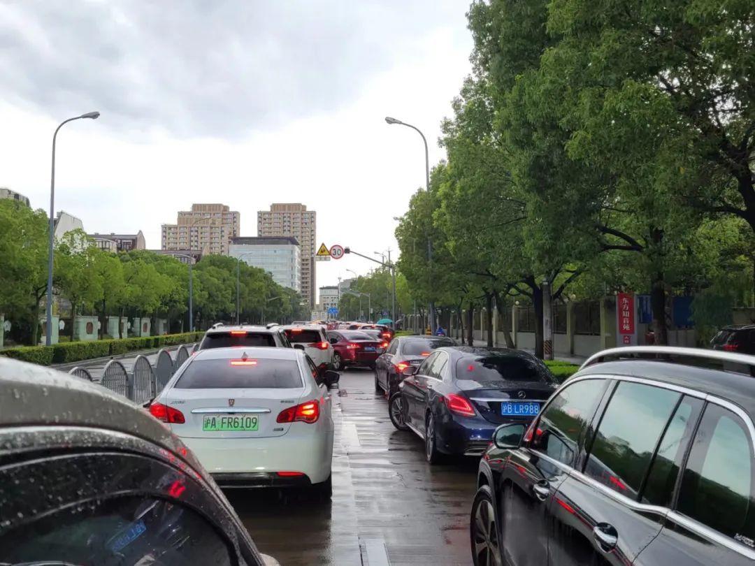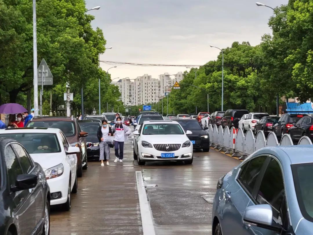 在浦东新区建平实验中学门口,7点半已经陆续有送考车辆抵达,8点不到,路边临时停车位已经停满,学校门口枣庄路南向北、博山东路到栖山路出现车辆缓行。