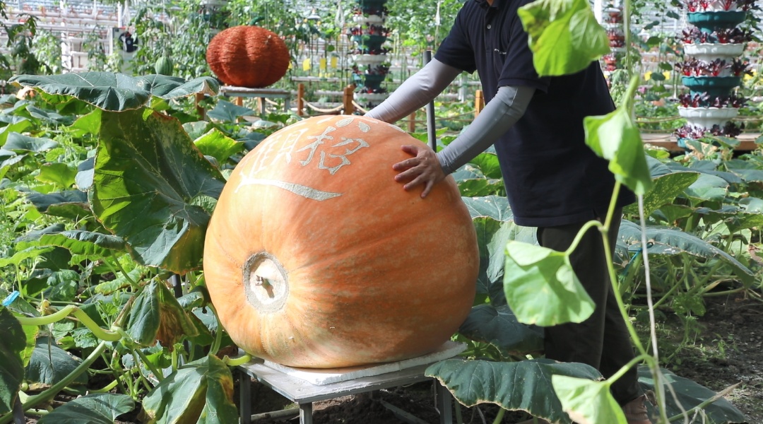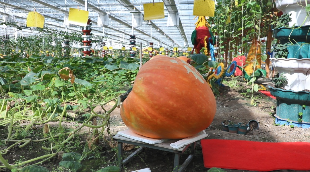 在智能设备与人工照料的双重保障之下,今年,九丰的“明星产品”经过5个多月的成长,已逐渐成熟。在巨型瓜类种植区,3000多平方米的种植面积内,整齐排列着100多个巨大的南瓜,平均周长超过3.5米,直径超过1米,单体重量达400多斤。在耀眼的金色外皮上,还有工人手工雕刻上去的吉祥祝福的字样。