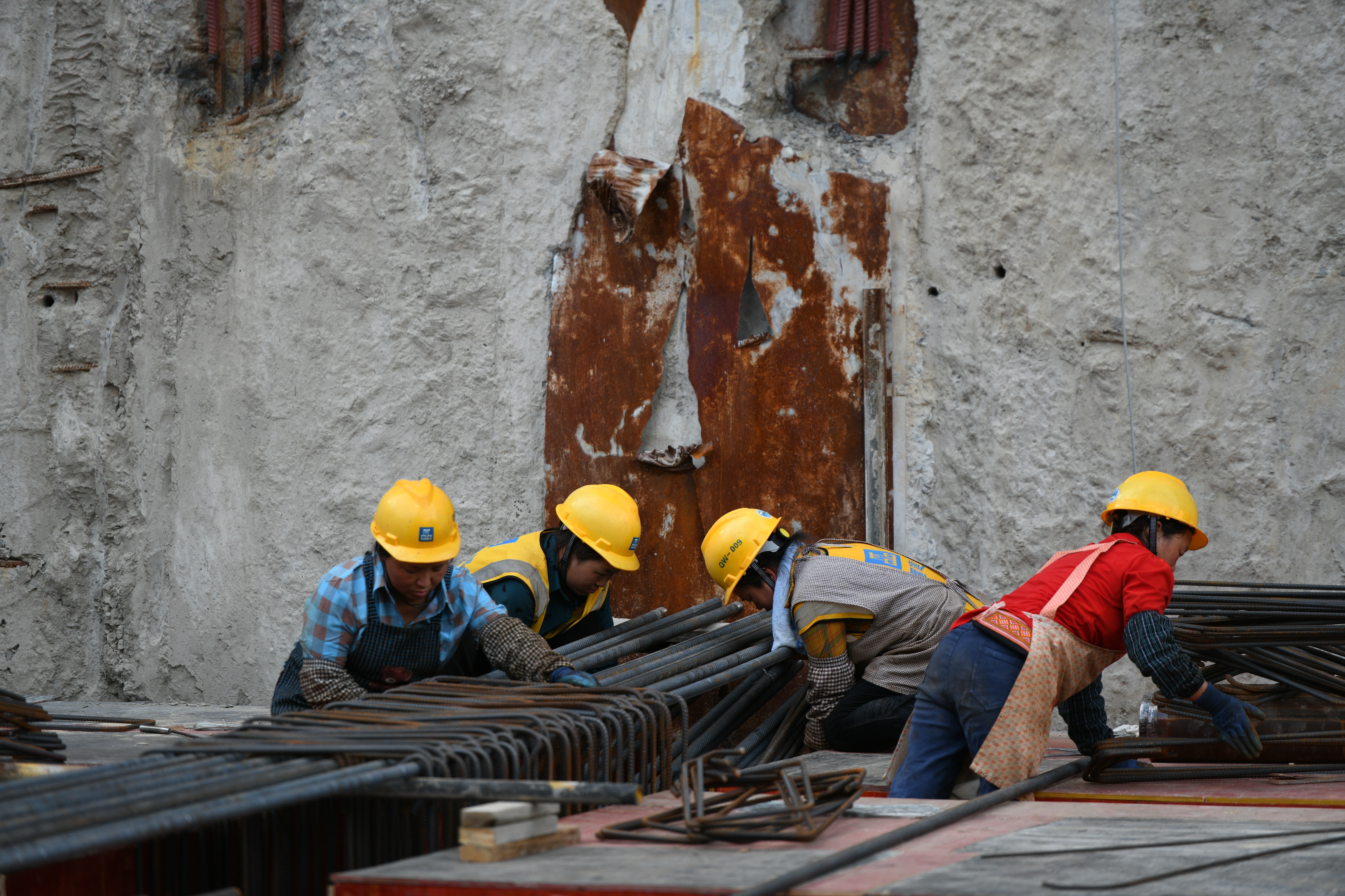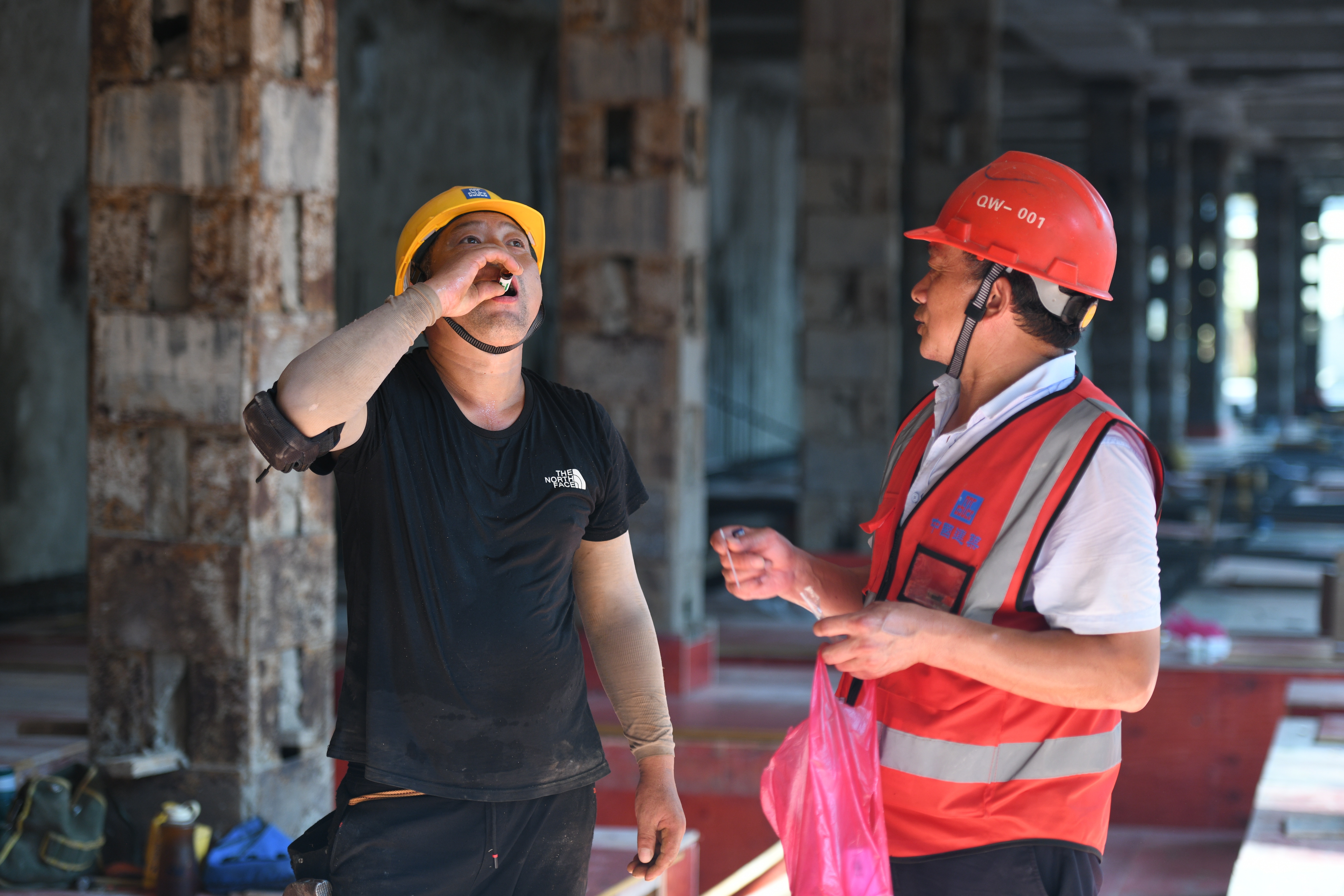 在没有任何遮挡楼的顶部工作面,热浪下,短短几分钟,绑扎和支模班组的工友们顶着烈日,不一会儿便已汗透衣裤。他们手里一刻不停,一干就是两三个小时,汗水顺着脸颊不停的往下淌。等到下工时,他们的衣服都能拧出水来。