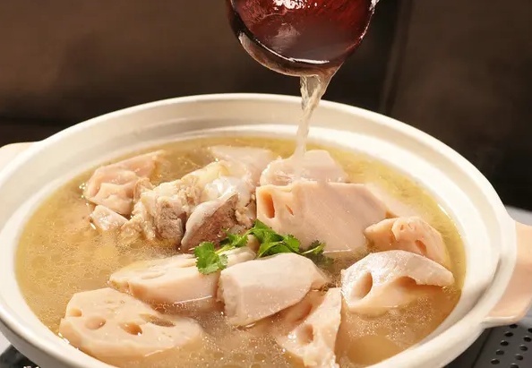 制作方法:将排骨洗净切成寸段,莲藕洗净用刀刮去表面粗皮后切滚刀块,备用;取炖汤锅放入清水,先放入排骨,煮沸后去浮沫,再加入莲藕块、生姜,用大火烧开后改用小火,炖1小时,加盐调味,即可。
