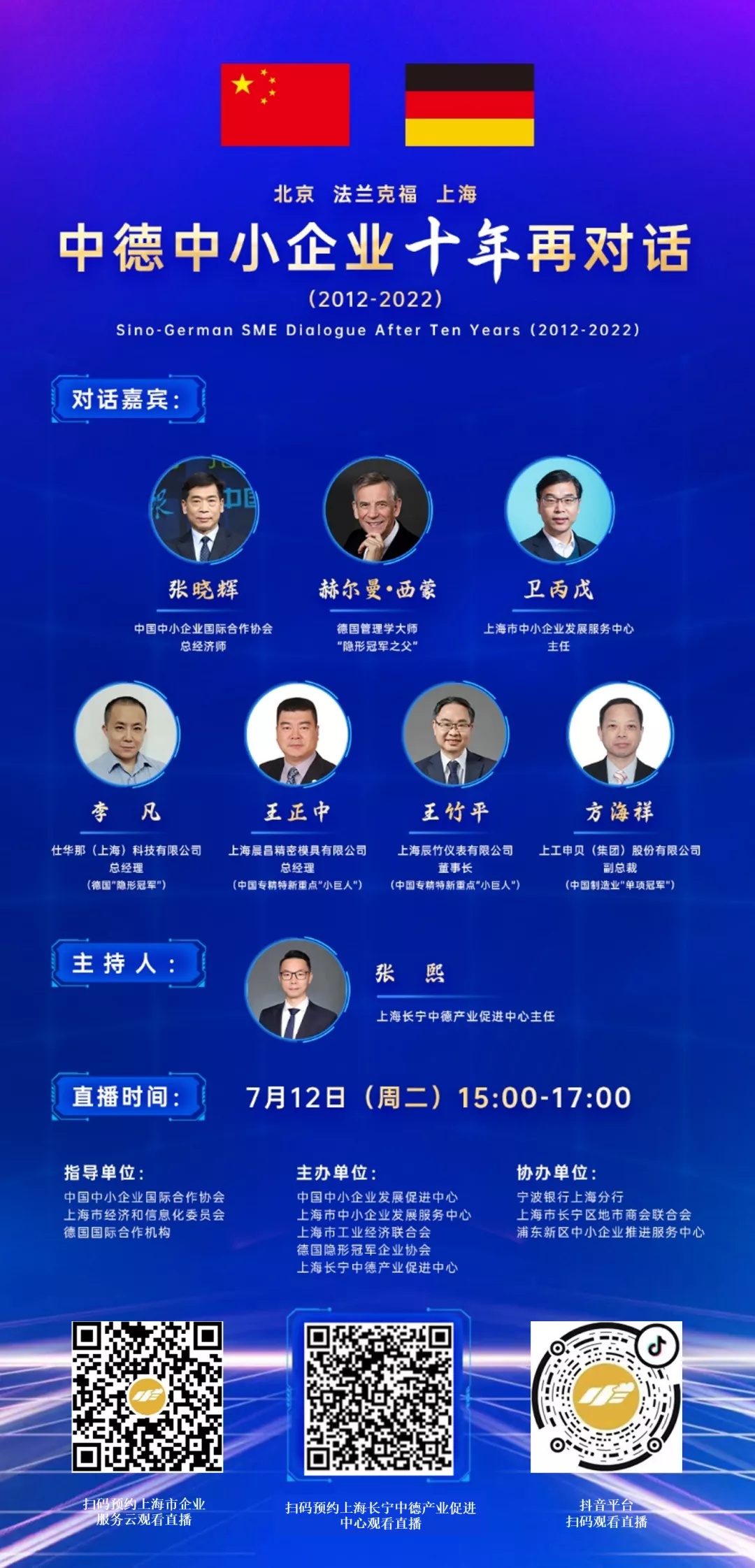 2022年,时值中德建交50周年。为促进中方企业与德国“隐形冠军”企业的交流,进一步培育专精特新“小巨人”企业和制造业单项冠军企业,助推中国制造业高质量发展,7月12日,北京、法兰克福、上海三地,中德中小企业十年再对话(2012-2022)——“小巨人”、“单项冠军”和“隐形冠军”活动将在云端启幕。