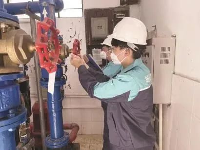 第一关,是泵房“蒸桑拿”。刘睿君告诉我们,泵房是小区供水的“心脏”,每三个月都要检查一下。钻进小区地下一层的泵房后,刘睿君首先检查了各处开关阀门是否正常,接着又打开控制柜,把每个触控开关依次检测了一遍。在他身边,侯韧手拿着一本表格,记下每一处的检查结果和数据。