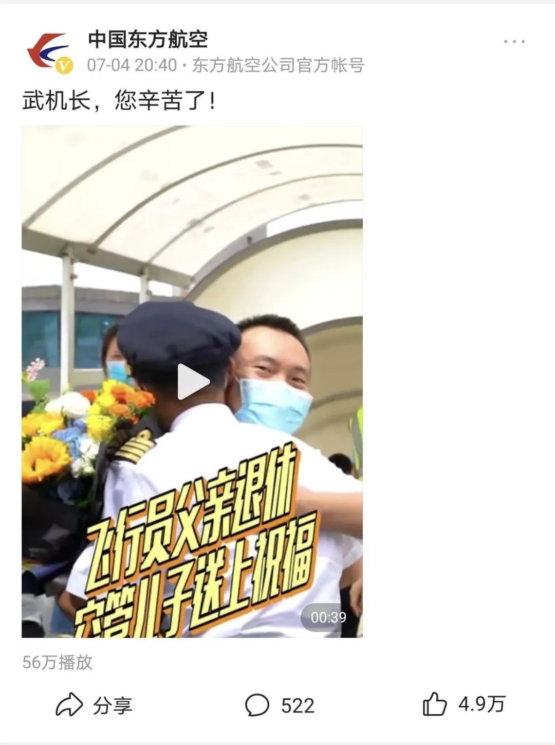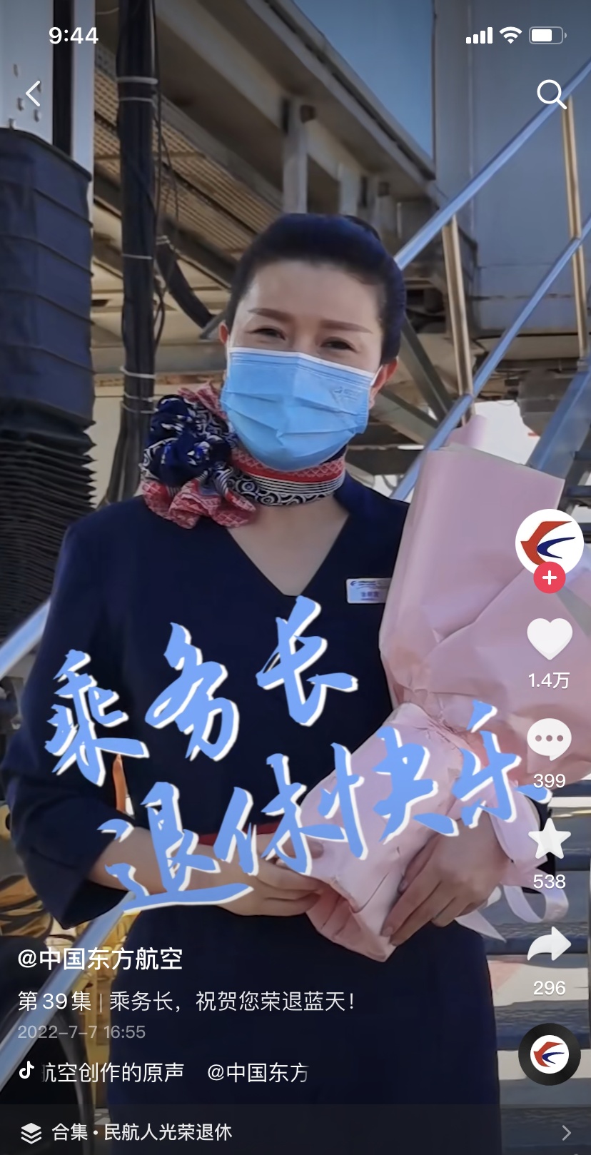 抖音、快手发布8期内容,总播放量7356万。其中“飞机起飞下降时,为什么关闭客舱灯光?”相关航空科普短视频已过1.5亿播放量。“东航机长与空管儿子的温馨对话”相关内容登上抖音实时上升热点。张明霞乘务长,祝贺您荣退蓝天!飞行27年,云上的日子,是她一生中最珍贵美好的时光,她将带着对蓝天的热爱,开启新的生活之旅。乘务长,退休快乐!