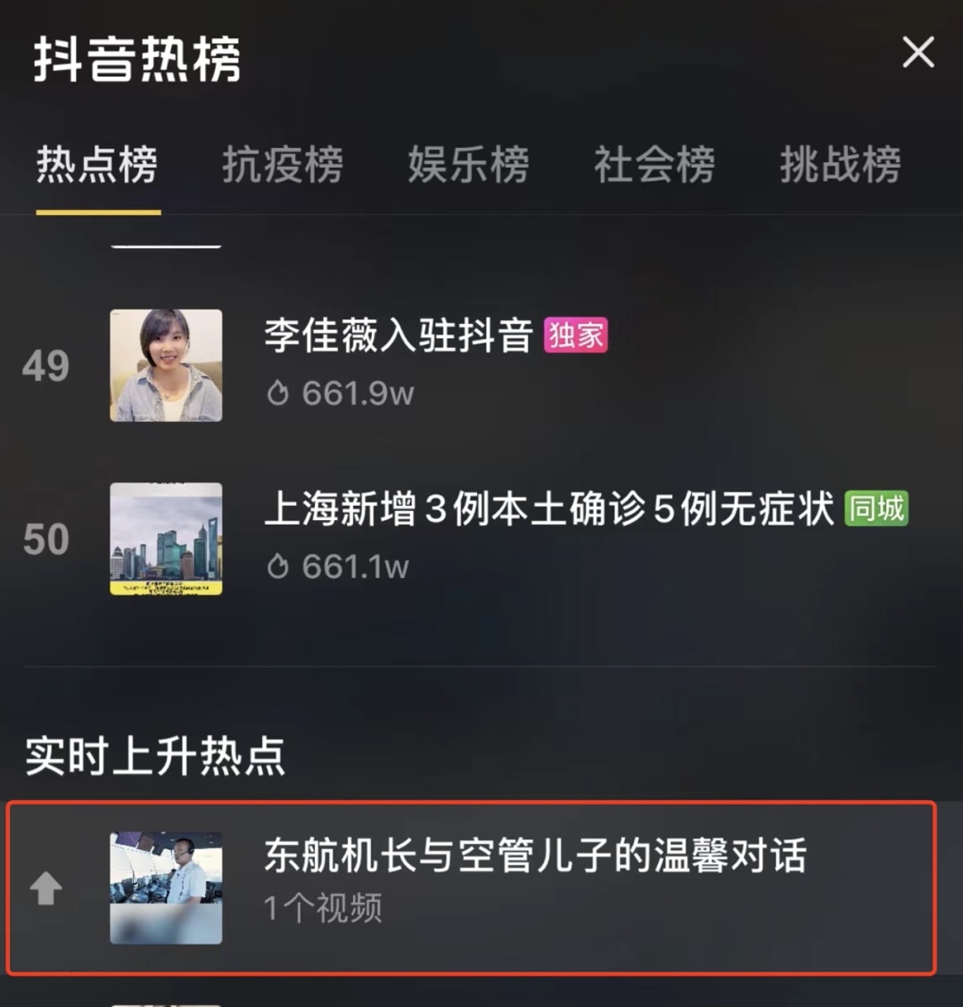 “东航机长与空管儿子的温馨对话”相关内容登上抖音热榜