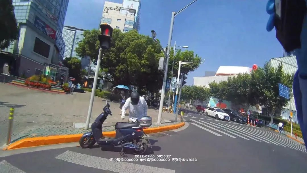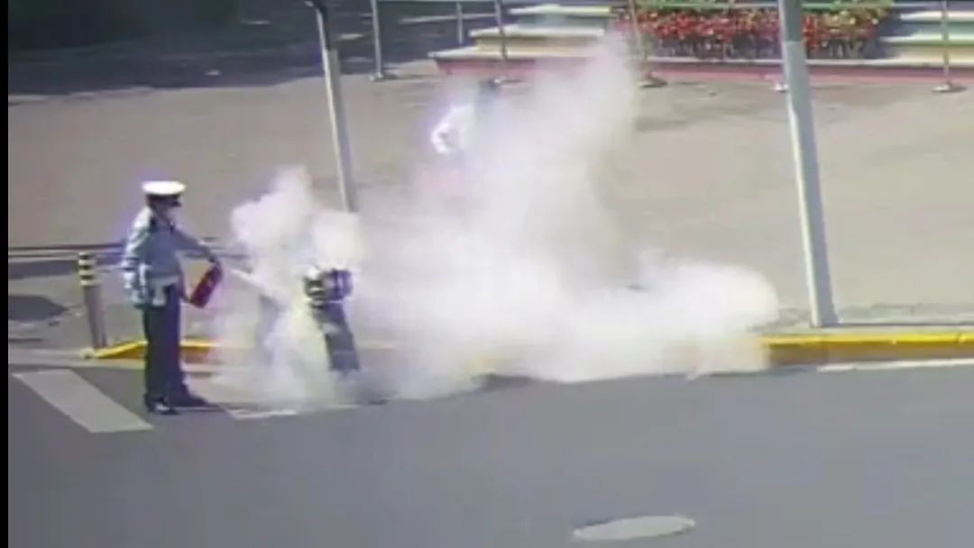 一位市民在骑电动自行车的时候,发现座椅下有烟雾冒出,感觉不对劲后,赶紧停车向路口执勤的辅警求助。公共视频和执法记录仪记录下了当时的紧急情况↓↓↓