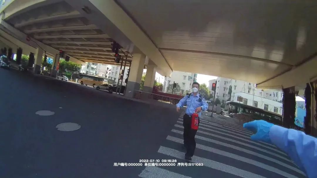 7月10日上午9点14分左右,在共和新路大宁路路口执勤的静安公安分局交警支队三大队勤务辅警朱晨悦接到市民求助后,立即通过电台呼叫同事曹波带来灭火器。