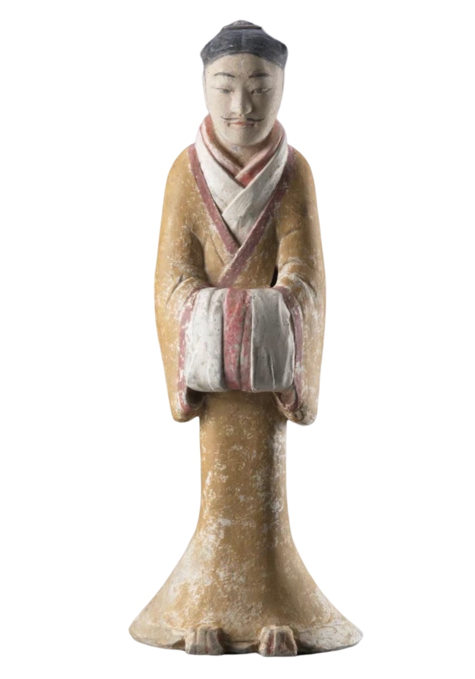 陶俑通体施黄色彩绘,面庞圆润,黑须红唇,两颊有丝带垂至颏下,脑后冠下梳髻。身着直裾三层深衣,腰部系带,袍缘呈喇叭状,长及足面。双臂下垂,拢于袖内,左肘内侧偏上有一长方形狭孔,原应为插剑之处,双膝微屈,着方头履。展现出恪尽职守、恭谨唯命的文吏或侍从形象。