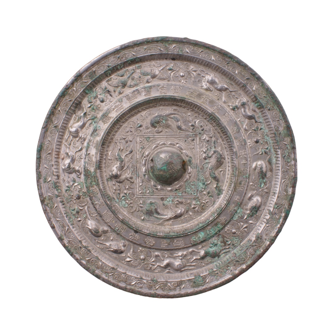 该铜镜出土于乾陵陪葬墓章怀太子墓,很可能是章怀太子李贤妻子清河房氏生前所用之物。铜镜背面刻有蔓草、青龙、鸾鸟、麒麟、凤凰等一些祥瑞的花草和鸟兽,且有32字楷书铭文,开头为:“鉴若止水,光如电耀,仙客来磨,灵妃往照”,故命名为“鉴若止水”镜。这面铜镜纹饰漂亮,铭文内涵丰富,制作工艺精湛,可说达到了唐代铜镜制作的极致,堪称铜镜中的经典制作。