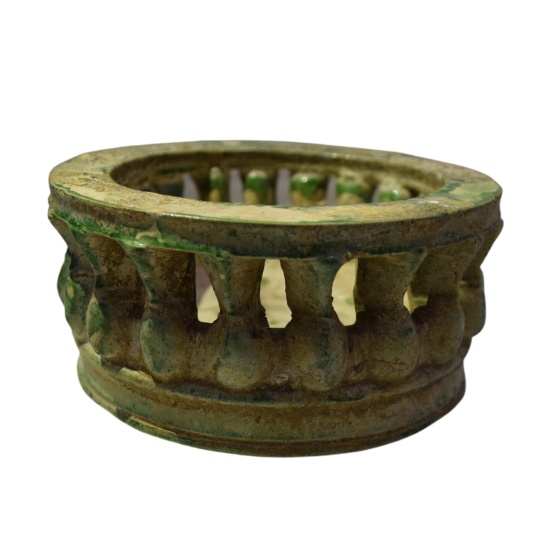 砚面圆形,砚面与外沿之间有一周凹槽,用以承存墨汁,砚底圈足之上,有多只蹄足环砚一周,承托砚面。辟雍是周代的学校,结构为圆形,围以水池,砚台以形似辟雍的设计而得名。辟雍砚南北朝时期就已经出现,而后广为流行,形制多有变化。初时有盖,蹄形三足,后足数渐多,由矮肥趋于高厚。隋代以珠形足取代蹄形足。唐代恢复蹄足,有的砚足多达20只以上。