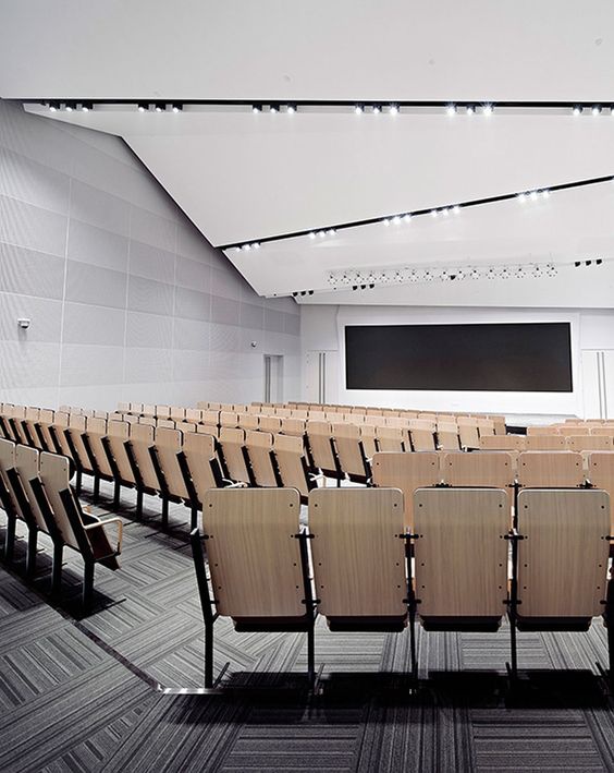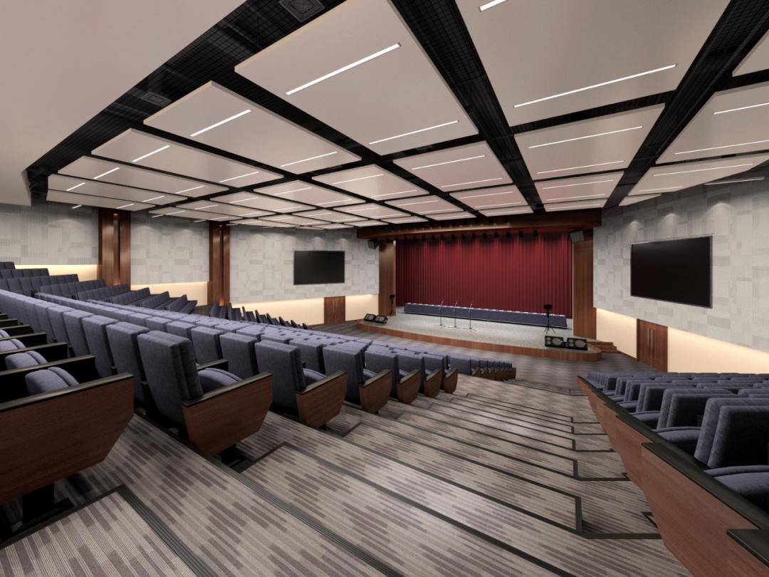 多功能活动室可容纳约200人,整体呈现简约风格,氛围浅色明亮,搭配沉稳木纹座椅陈设,轻松之余不失庄重。
