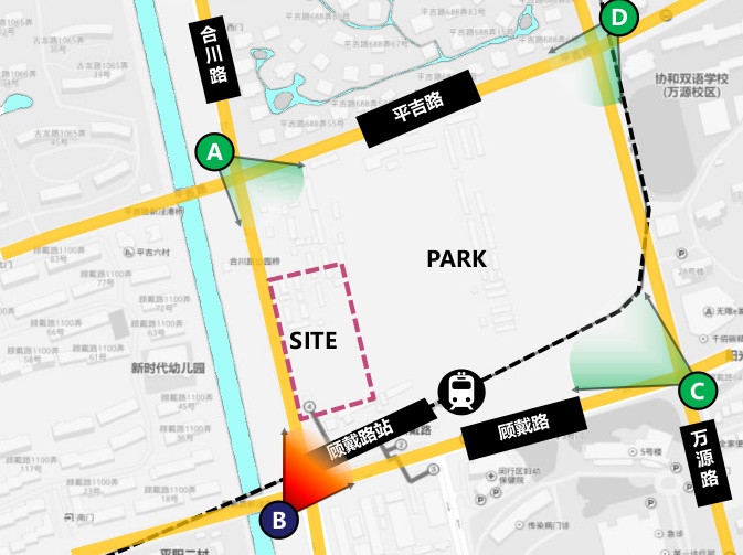 古美文体活动中心项目由中建四局承建,位于古美路街道主要路段,南侧为顾戴路,西侧为合川路,东侧与北侧毗邻古美公园,周边还有商场、医院、地铁、居民住宅区等场所。12号线顾戴路站出口即可到达,极大地方便了市民来到这里参与丰富多彩的文体活动。