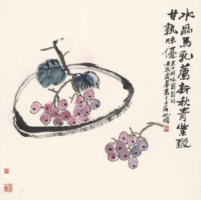 朱屺瞻的绘画题材常常来源于生活,他将恣意挥洒的笔触融入画中,借明快淡雅的色彩来表达对人生的祝福,马乳葡萄酸甜适宜,回甘无穷,恰如夏季炎热非常,却也生机勃勃。