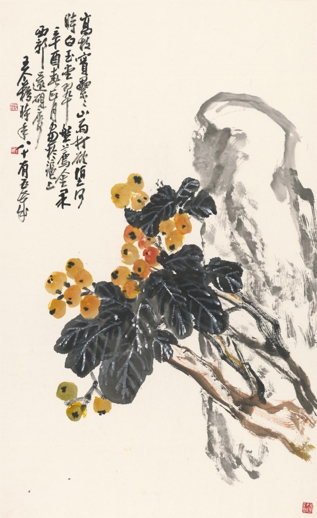此幅《枇杷》静中有动,妙趣横生。王个簃将枇杷果以土黄色线勾轮廓,继而填入金黄色,最后以赭色绘脐,三种不同的暖色水乳交融,展现出枇杷果夏季成熟期的丰满甜美。枇杷叶用笔致工整细腻的重彩法表现,如实地刻画出叶面反转向背的各种自然形貌。