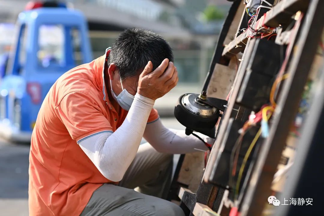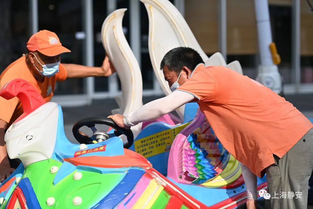在户外儿童乐园,检修人员汗流浃背地对游乐设施进行检测维修,此时地面温度已有50多度,他们穿着定制的工作服,戴着防晒套袖,为游客安全护航。