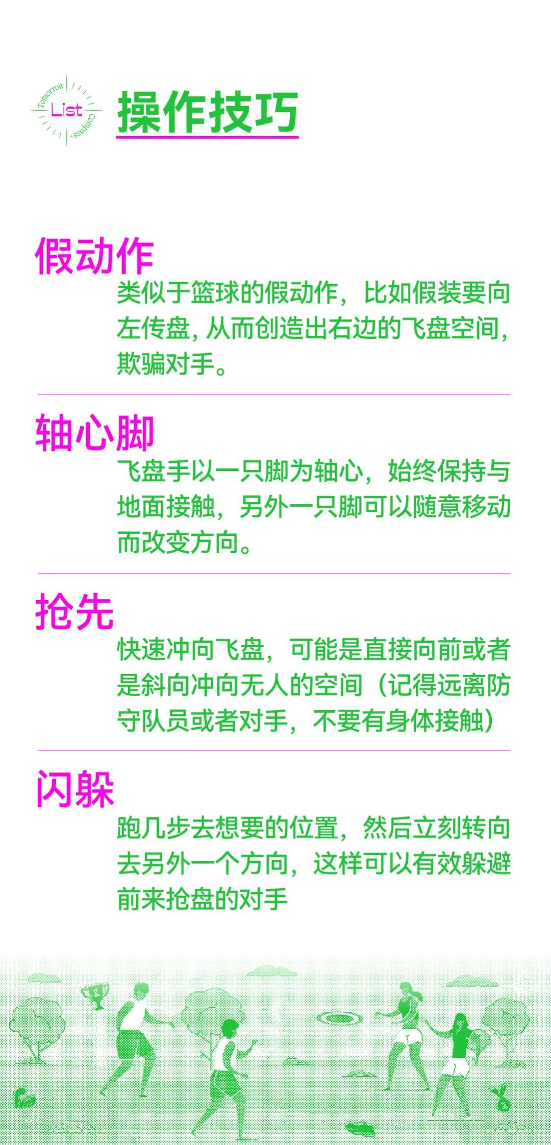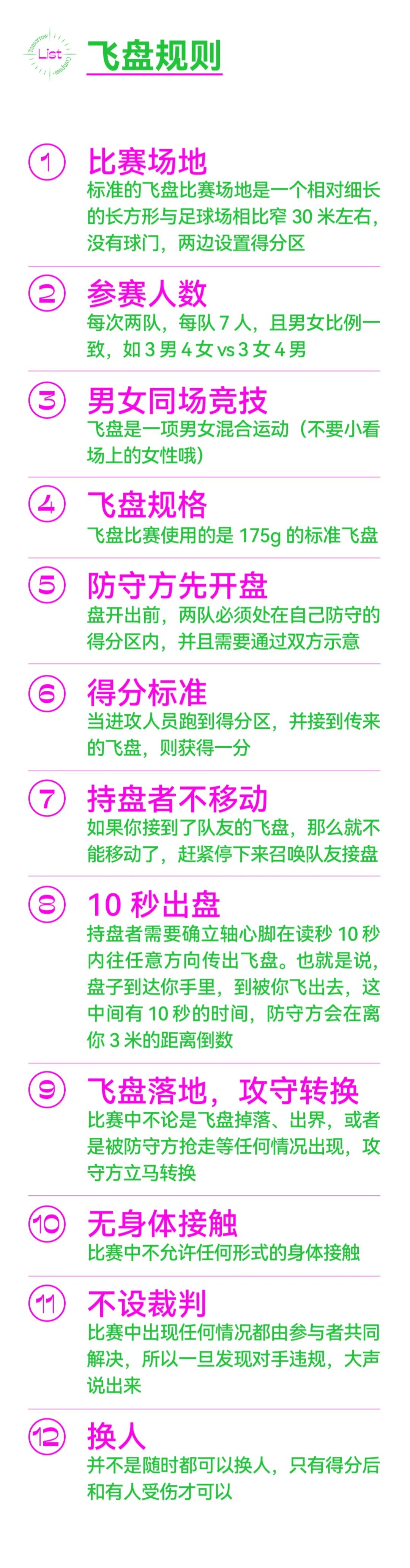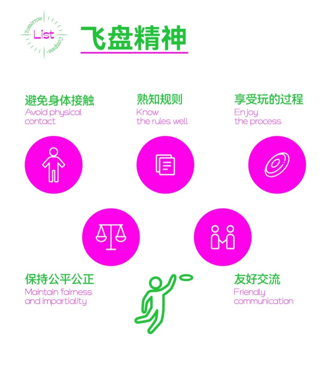 “新手接触飞盘这项运动的时候都是先接触到飞盘,然后才去了解飞盘规则的,但其实在没有规则、不懂规则的情况下玩飞盘是非常危险的”,李耕指出,世界飞盘联合会制定的飞盘规则第一条就强调了飞盘是一项无身体接触的运动。其次,飞盘犯规规则的第一条就是“任何可能造成其他盘友受伤的动作,都是危险动作”。