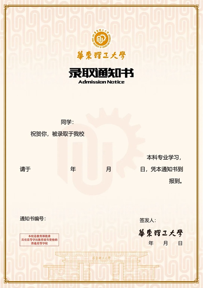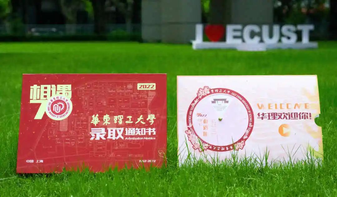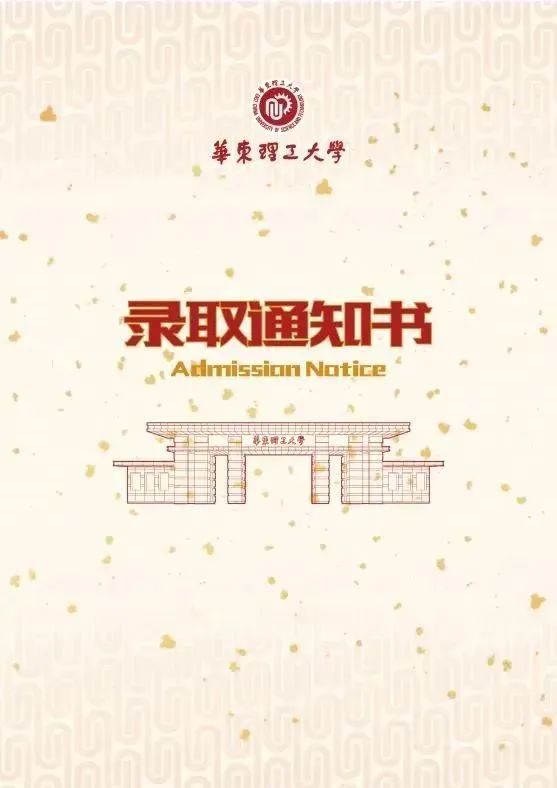 通知书正面印有正文,中间放大版的华理Logo,呼应着底部的华理校门,无处不在的学校元素,期待着与学子们在美丽校园相见。背面印着敞开的华理正门,在洒金背景中显得格外威严气派,象征着学子们将在这里开启一段辉煌的征程。