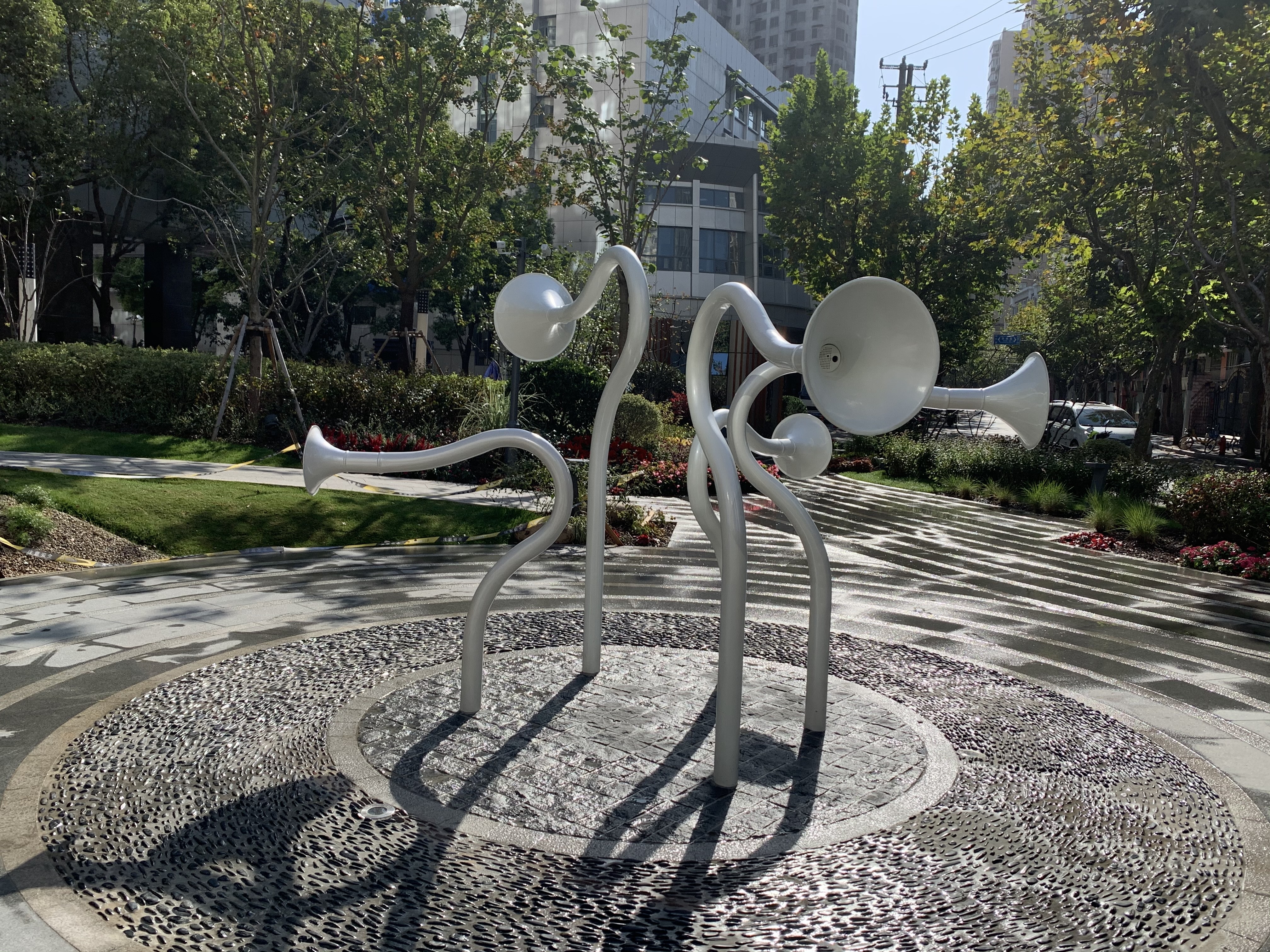 特别的是,音花园设置了喇叭造型的雕塑及互动装置:以喇叭为原型,经过艺术化创作,结合红外感应装置和声音播放,通过红外感应的互动形式,播放鸟鸣、流水等各种自然之声。
