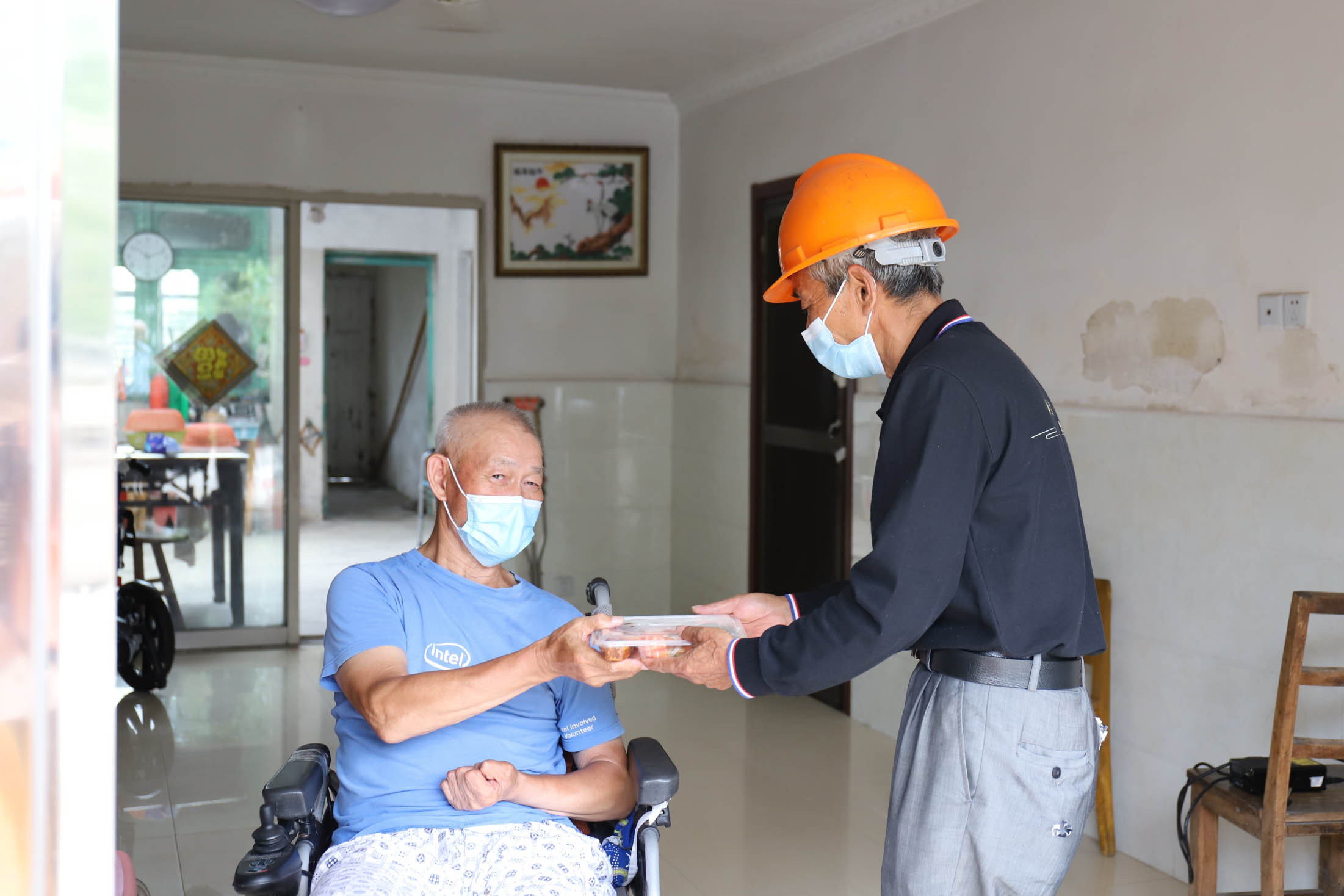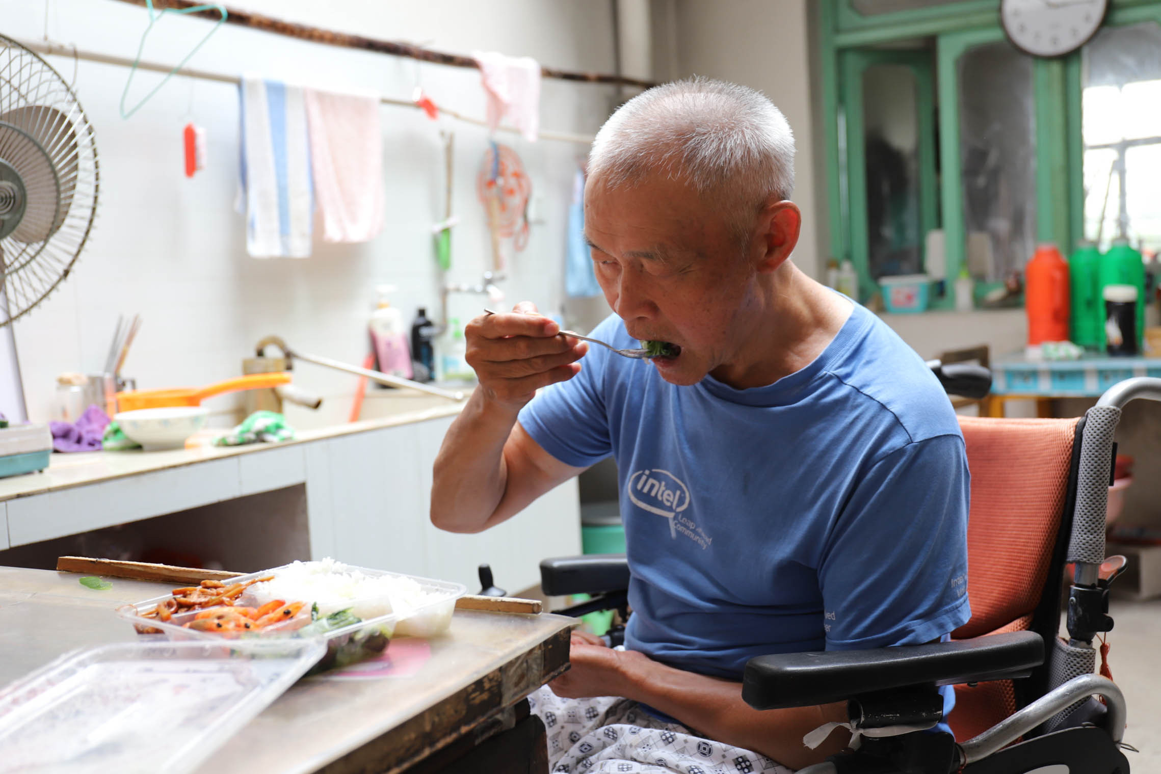 当天中午,食堂工作人员龚小弟来到黄桥村村民董阿塔家送餐。看到熟悉的工作人员,他笑吟吟地招呼对方进门。董阿塔年过八旬,因病行动不便,常年乘坐轮椅,子女不在身边。每每上门送餐,龚小弟总是先替董阿塔将餐桌上的杂物移走,然后帮他把餐盒打开,再将清洗后的不锈钢勺递给老人。董阿塔高兴地说:“我自己做饭不方便,基本每天都吃他们送的饭。”
