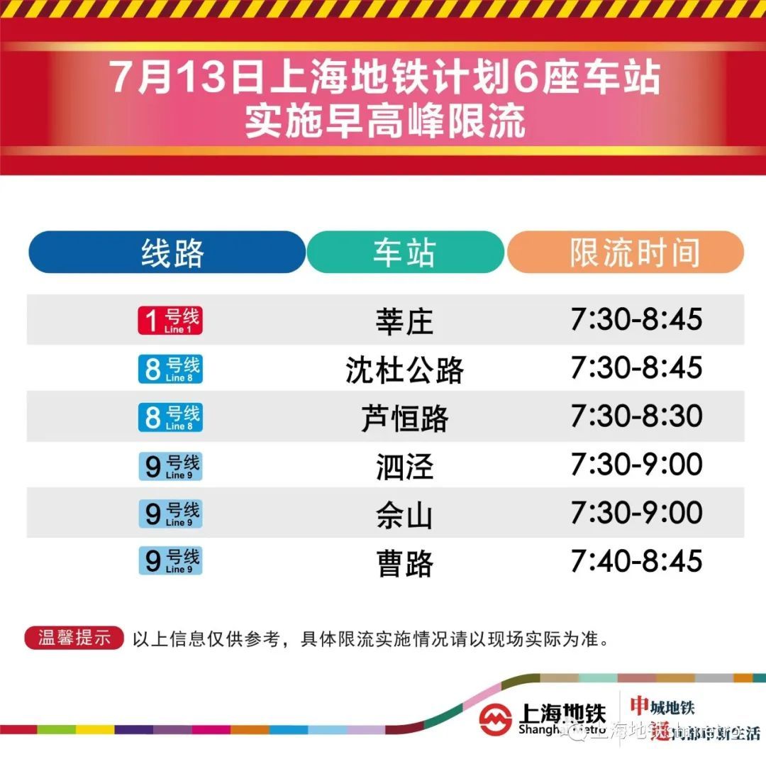 7月13日,上海地铁早高峰限流措施将继续实施,届时将有6座地铁站早高峰计划限流。