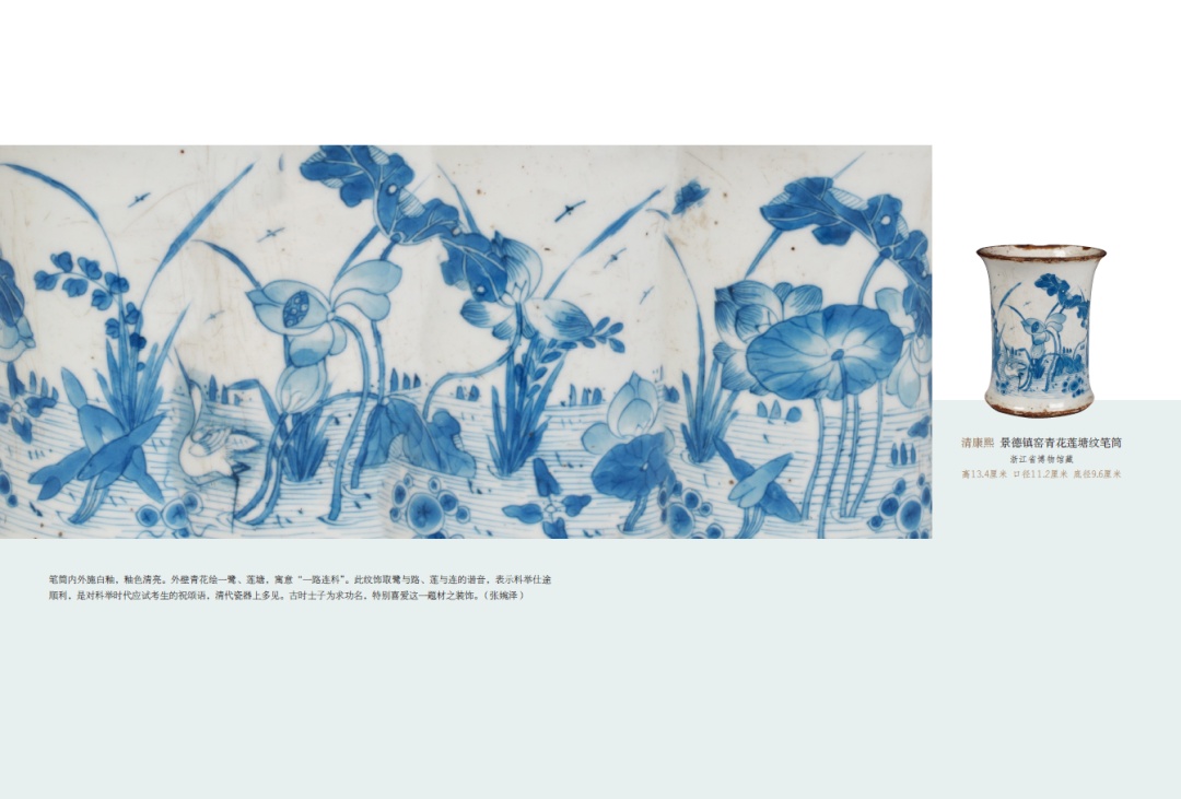 清代莲纹装饰,汲取了之前各时代的特色,形态特征从写实状到几何化,图案场景从以莲为独立纹样到与各类纹样组合出现,并逐渐形成了莲纹装饰的程式化形态。以陶瓷为例,随着青花、斗彩、五彩、珐琅彩等各个瓷器品种的争奇斗艳,莲纹装饰也呈现出从纯色素雅到五彩斑斓的趋势。