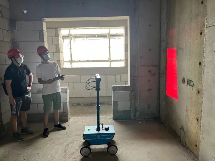 此前在上海交大医学院项目已实施运用了抹灰机器人,现在智能钢筋加工生产线“加盟”外,还多了一款实测实量机器人。该设备具有小巧灵活、操作简单、数据处理高效、报表填写规范等优点,可自主行走、躲避障碍,高效完成各分项工程实测实量相关任务。