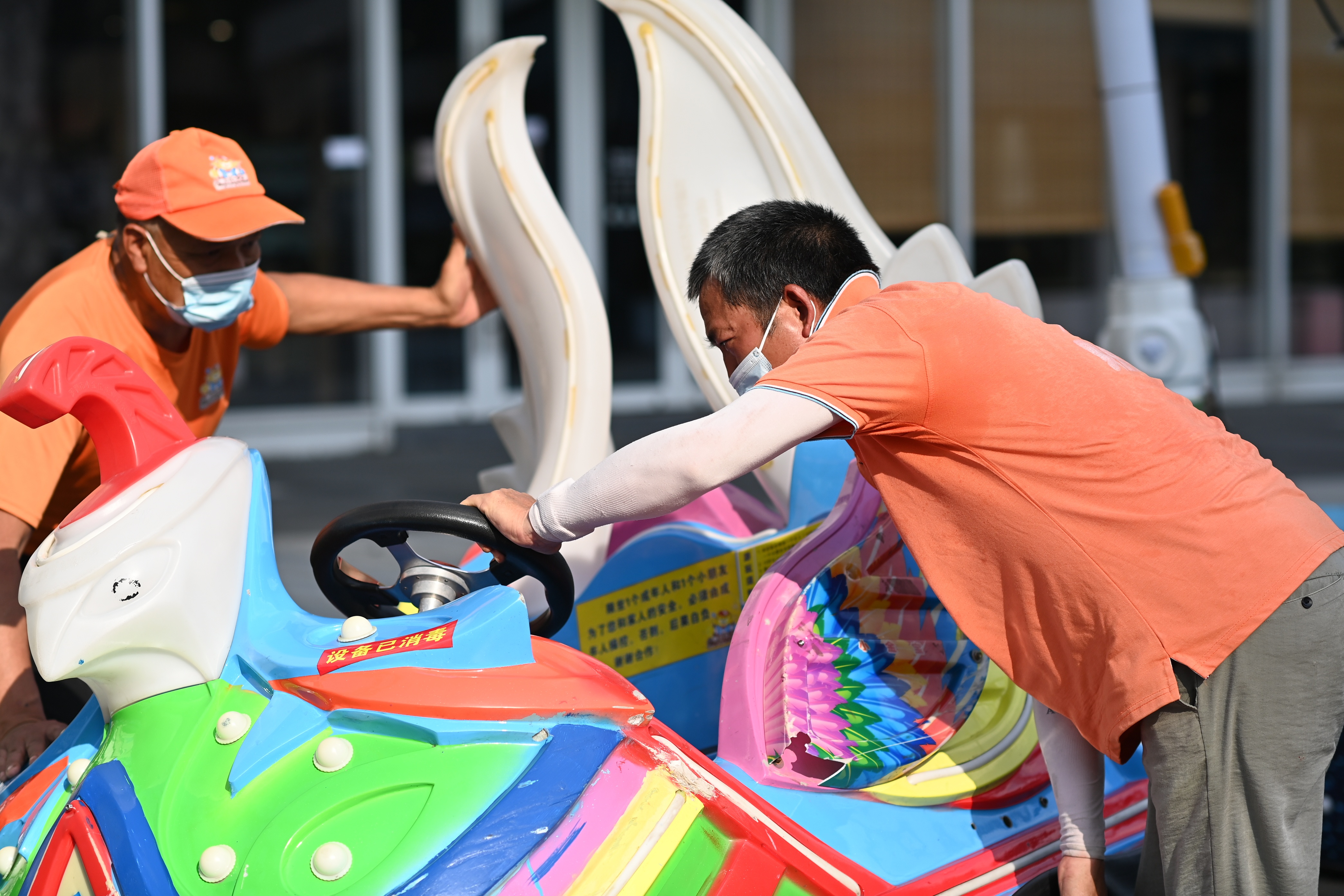 在户外儿童乐园,检修人员汗流浃背地对游乐设施进行检测维修,此时地面温度已有50多度,他们穿着定制的工作服,戴着检修专用手套,为游客安全护航。