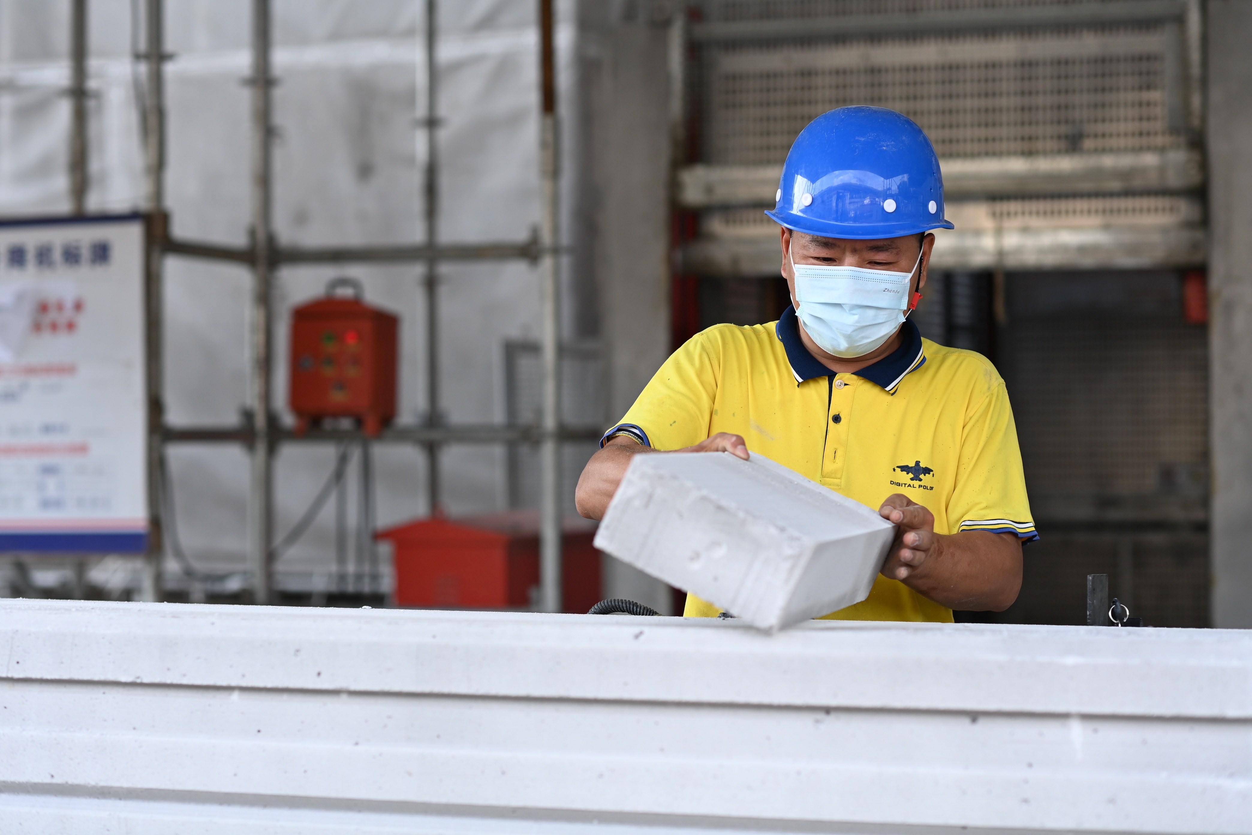 在汶水路建筑工地,工人师傅们正在搬运建材,他们头顶安全帽,手臂被阳光晒得通红,豆大的汗珠顺着脸颊滴落。