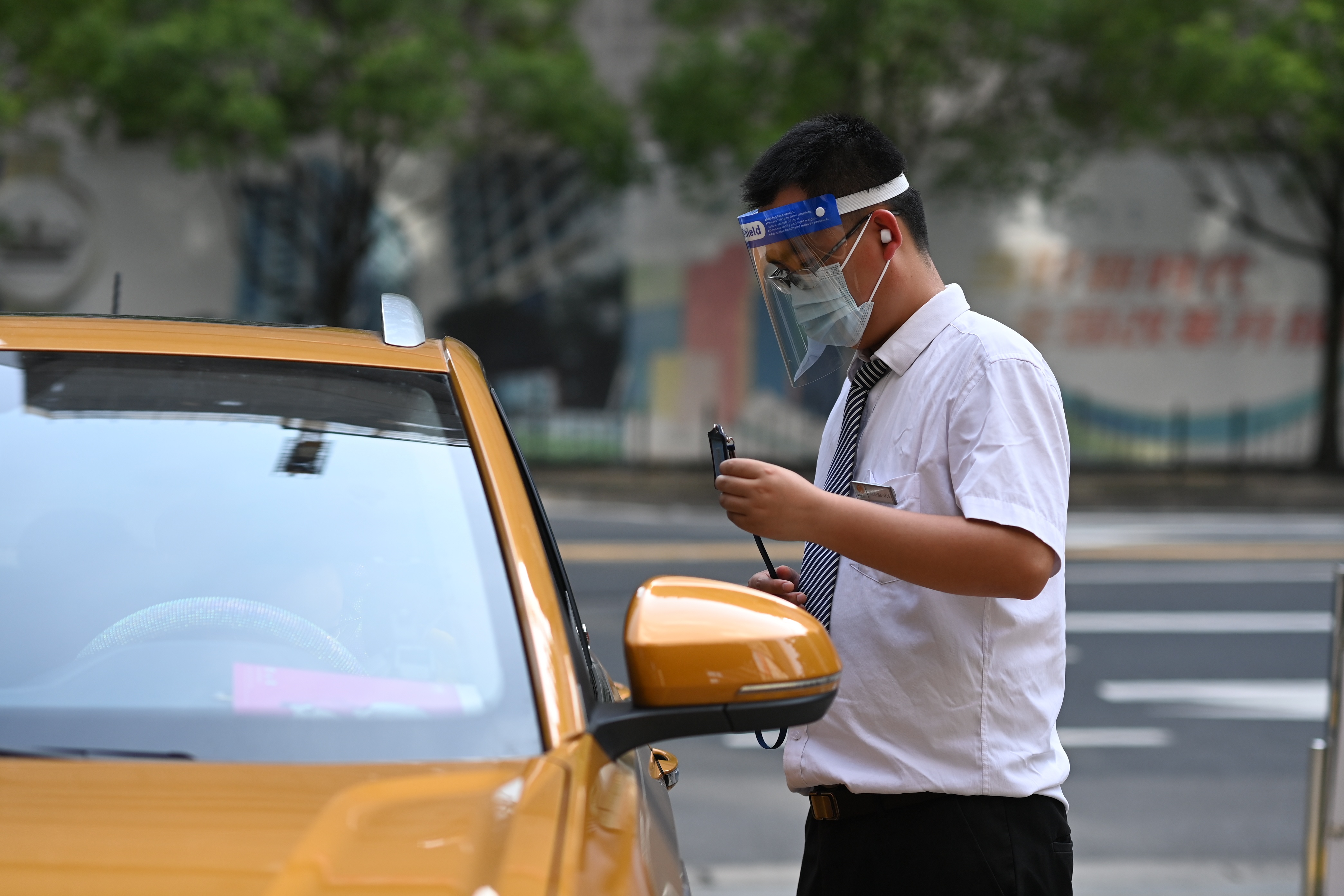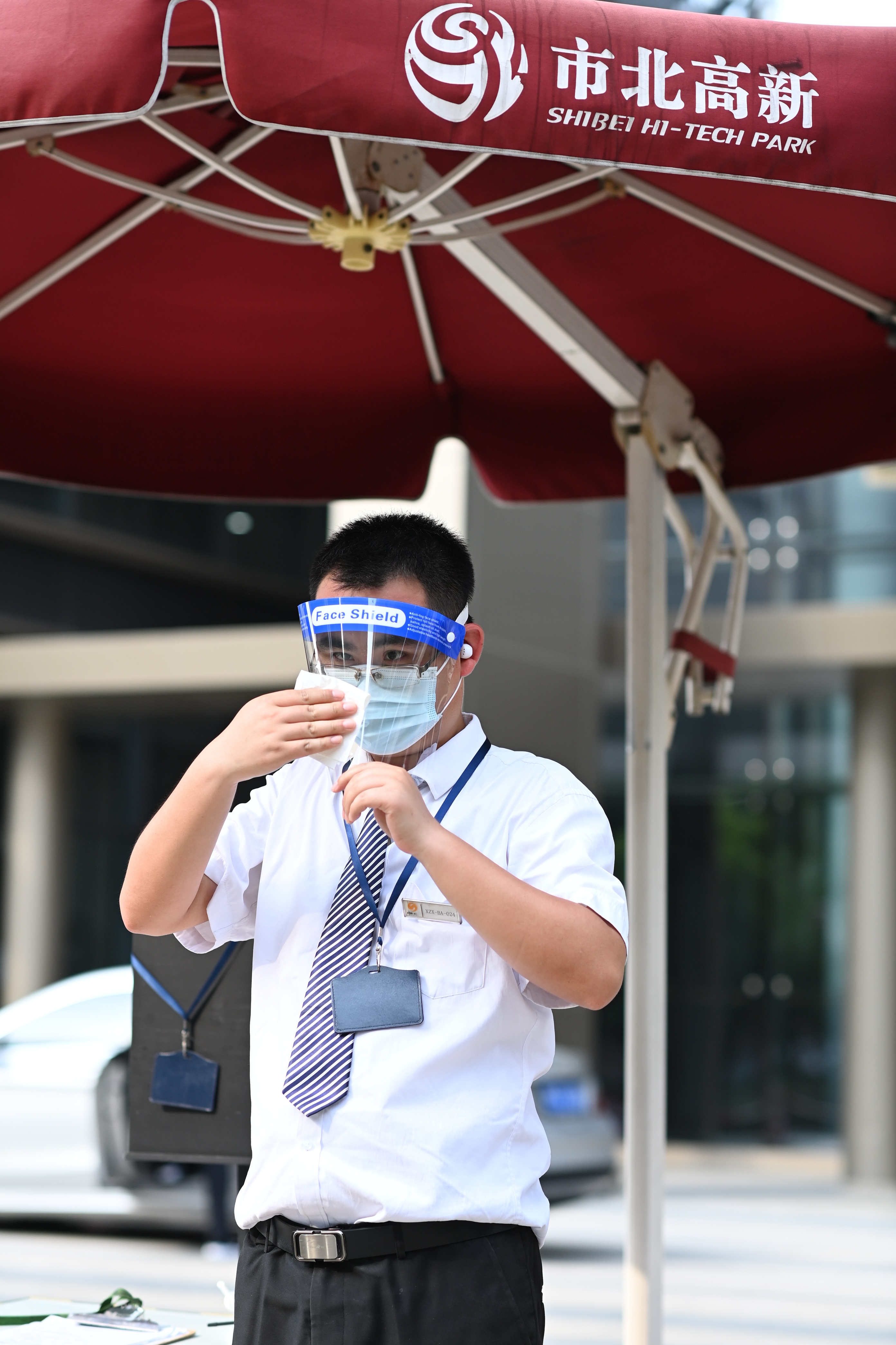 在市北高新园区,物业工作人员在烈日下有序引导进出车辆,进行防疫检查登记,为园区的安全站好每一班岗。