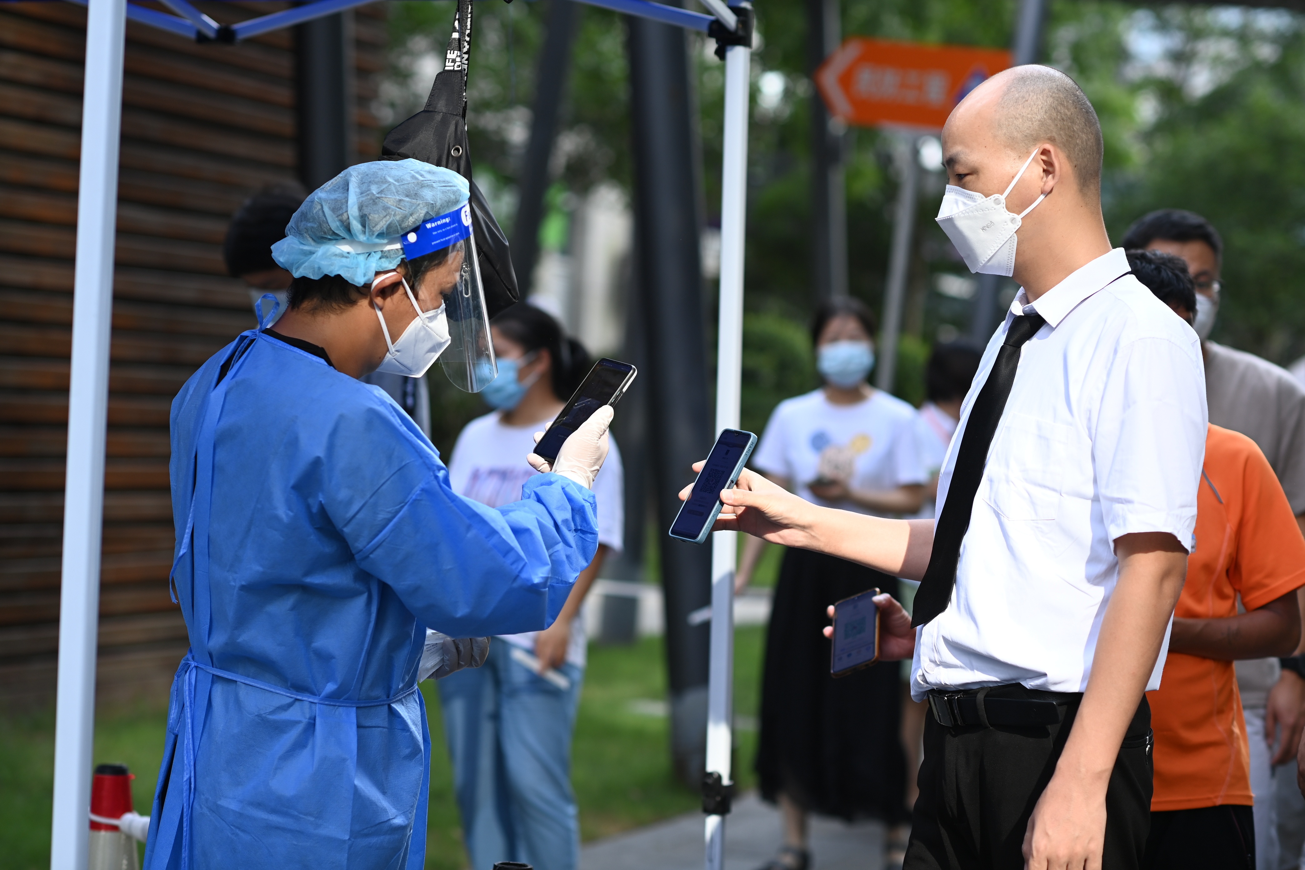 在核酸检测现场,全副武装的“大白”“小蓝”们,冒着高温酷暑,紧张有序地开展工作。由于天气炎热,不到半小时汗水就顺着皮肤流到了脚底,防护服内的衣服早已打湿,面罩里全是汗水。