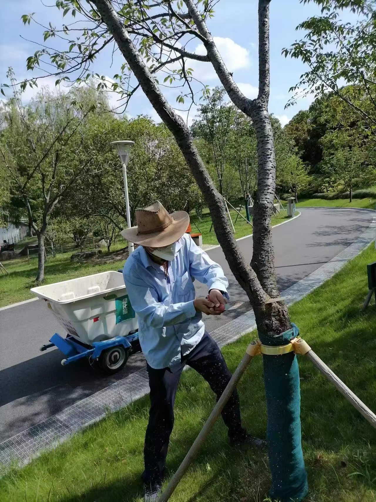 随着气温不断升高,绿化树木、草坪进入了生长最佳阶段。在大宁公园,工人师傅冒着酷暑给道旁的树木修枝,进行绿化养护管理,使公园内整体景观效果更好。