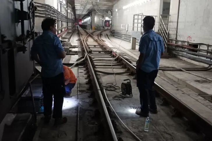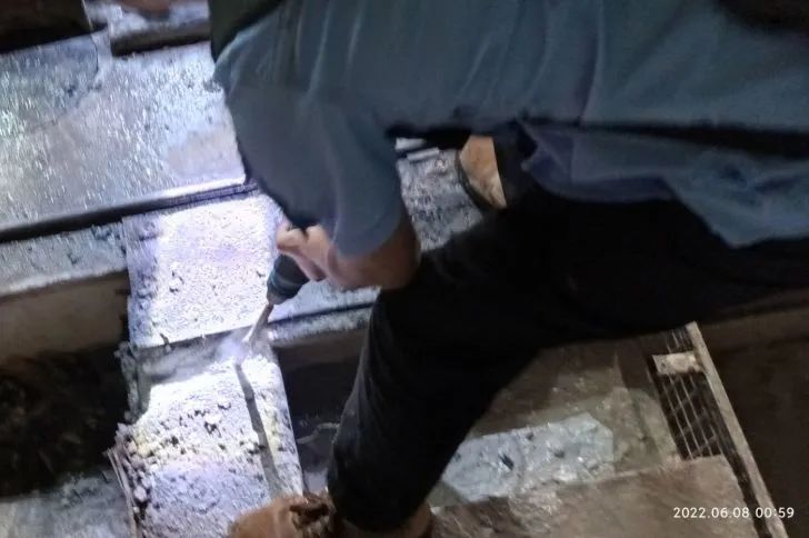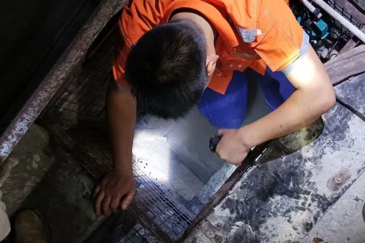 检查的过程中,当我们来到了江浦路站的下行站台车尾位置,现场发现在车站站台落水口的位置的积水偏多。水位已没过沉淀池集水井,经现场查看和分析后,初步判定这条排水沟并不直线连通,原本在钢轨下方有一条连通的排水暗管有混凝土阻塞,调查认为可能与排水线路走线相关,水流没法从下方暗管排出。