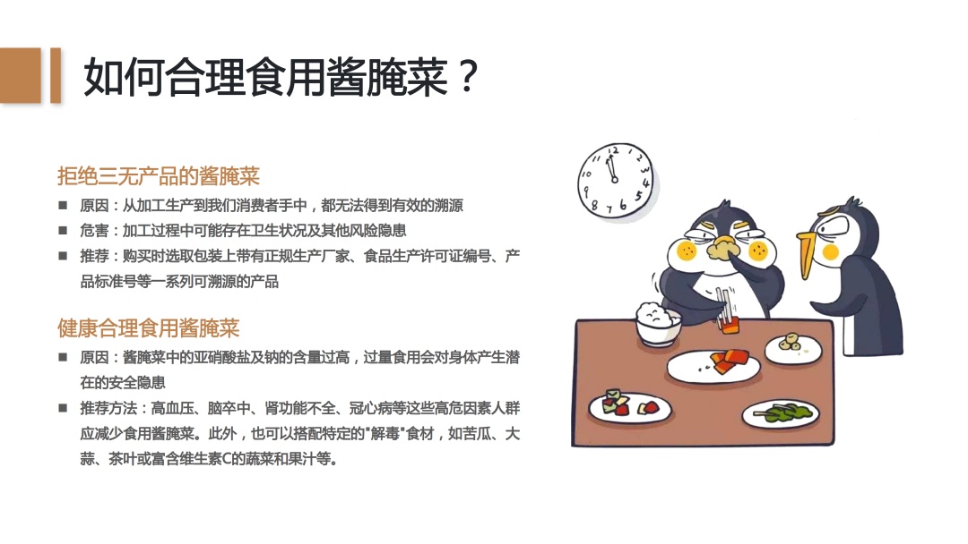 购买时,我们要挑选合格的酱腌菜产品。此外,酱腌菜中的亚硝酸盐和钠的含量较高,也不要过多食用哦。