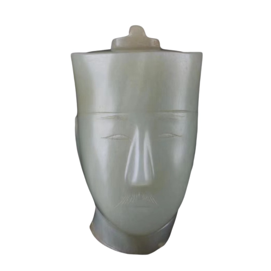 此件文物为玉俑的头部,从颈部斜侧断裂。玉料为青绿色,以圆雕、浮雕、阴线刻相结合的手法雕刻而成。高冠,长脸,眼为柳叶状,长鼻,抿嘴。阴线刻眉毛、胡须、发髻,髻作挽起状,有簪孔。此件玉俑头材质精良,造型逼真,雕琢精致,保存基本完好,是罕见的汉代玉雕精品。