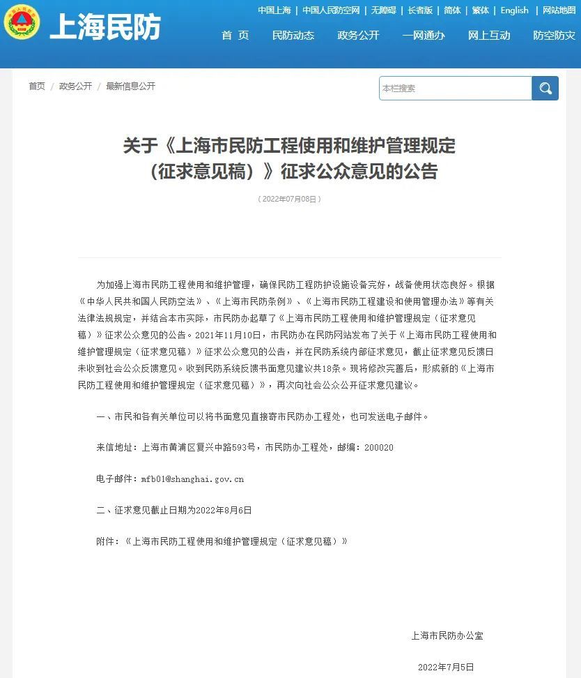 近日,市民防办将修改完善后形成新的《上海市民防工程使用和维护管理规定(征求意见稿)》,再次向社会公众公开征求意见建议。