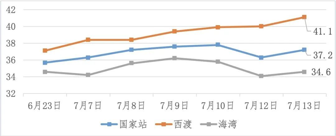位于奉贤区气象局内的奉贤国家气象观测站资料显示,截止7月13日奉贤已出现35度以上高温日7天,其中6月1天,7月6天。7月副热带高压明显偏强,在其控制下奉贤出现持续热浪天气,7月7日至7月13日已出现高温6天,明显多于常年。
