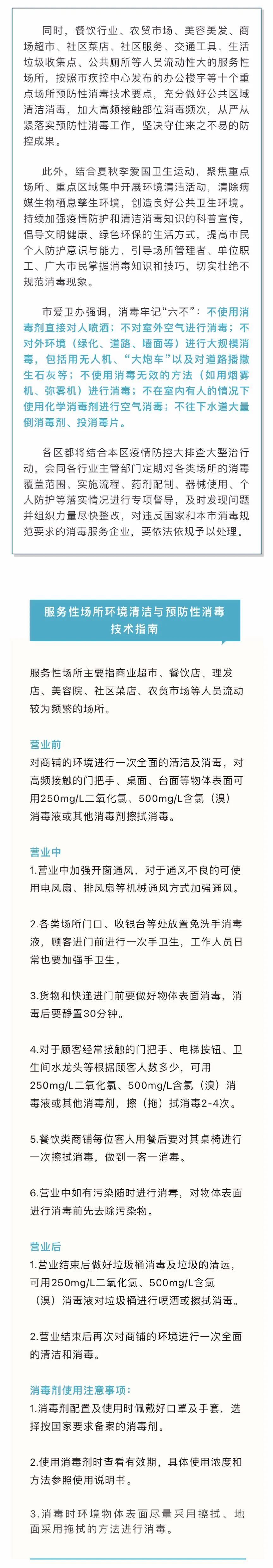 为进一步加强服务性场所环境清洁消毒管理,做好常态化疫情防控,市环境整治消杀专班、市爱卫办表示,落实清洁消毒措施是服务性场所开放经营的重要前置条件之一,各区应严格落实属地负责制,压实属地街镇管理责任、行业部门监管责任、重点场所主体责任、单位员工实施责任,确保环境消杀规范达标、消毒物资配备到位、员工防护措施落实到位。