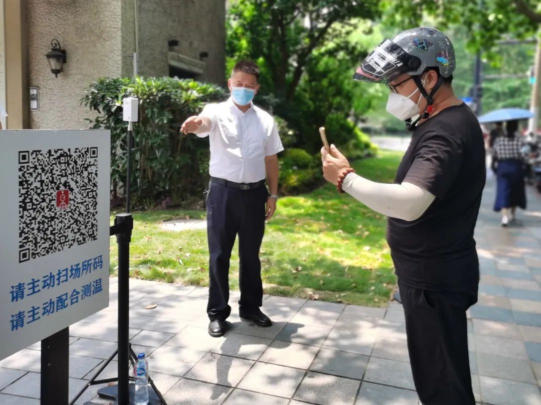 “你好,请扫描‘场所码’,测温后入内。”中午12时,顶着烈日创邑SPACE弘基保安队长赵松林正在园区愚园路入口处指引外卖小哥扫码,正值午餐高峰,前来送餐的外卖员络绎不绝。因长时间站在太阳下,他额头的汗珠顺着脸颊流下来,强烈的光线使他眯起了眼睛。