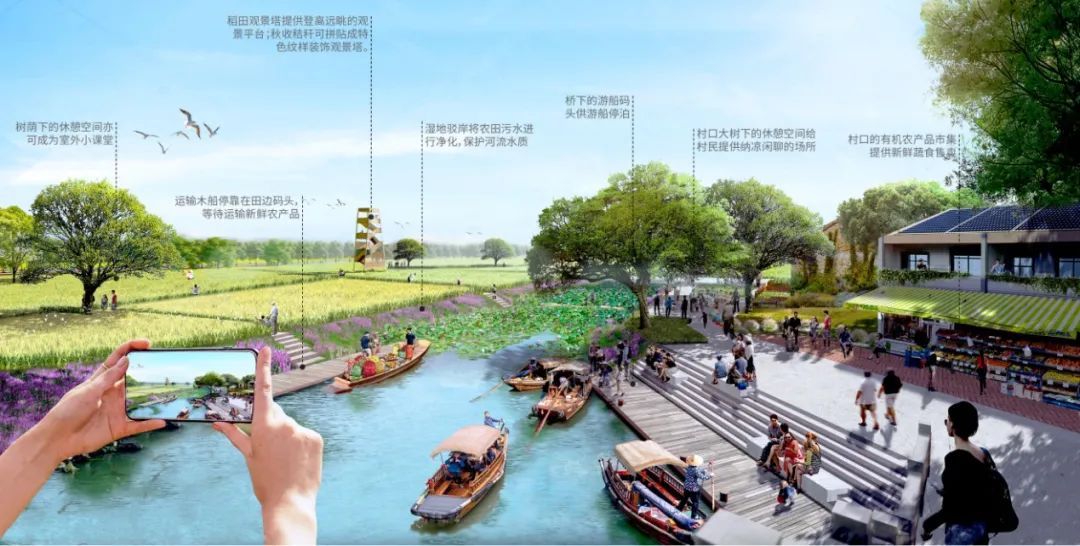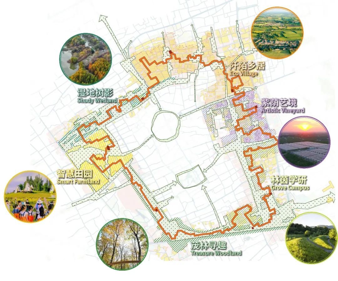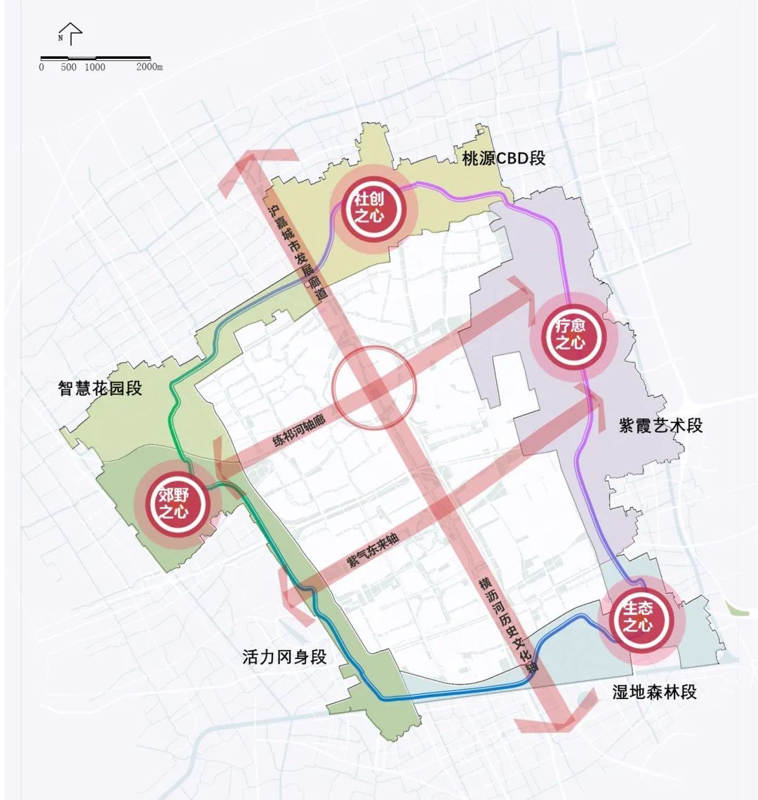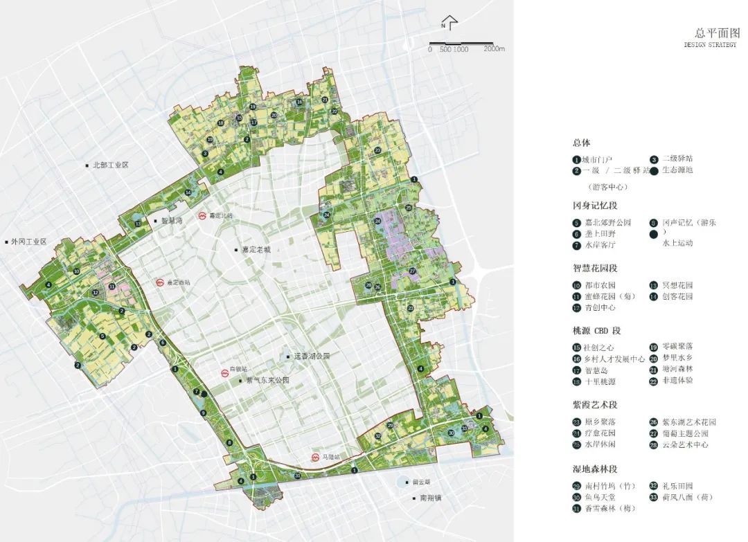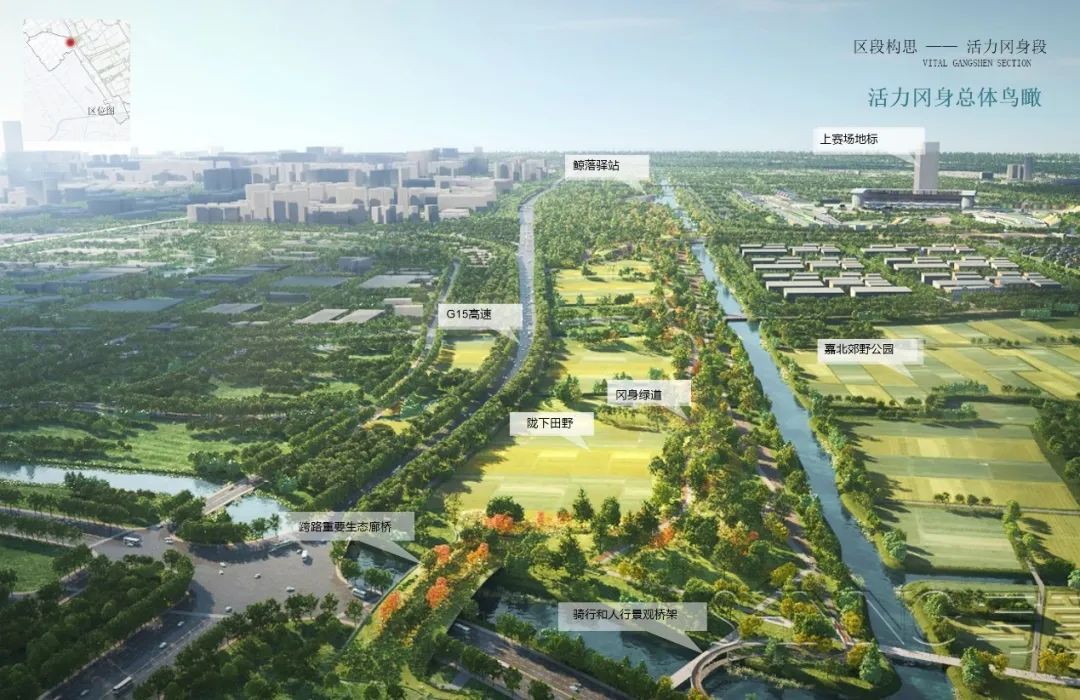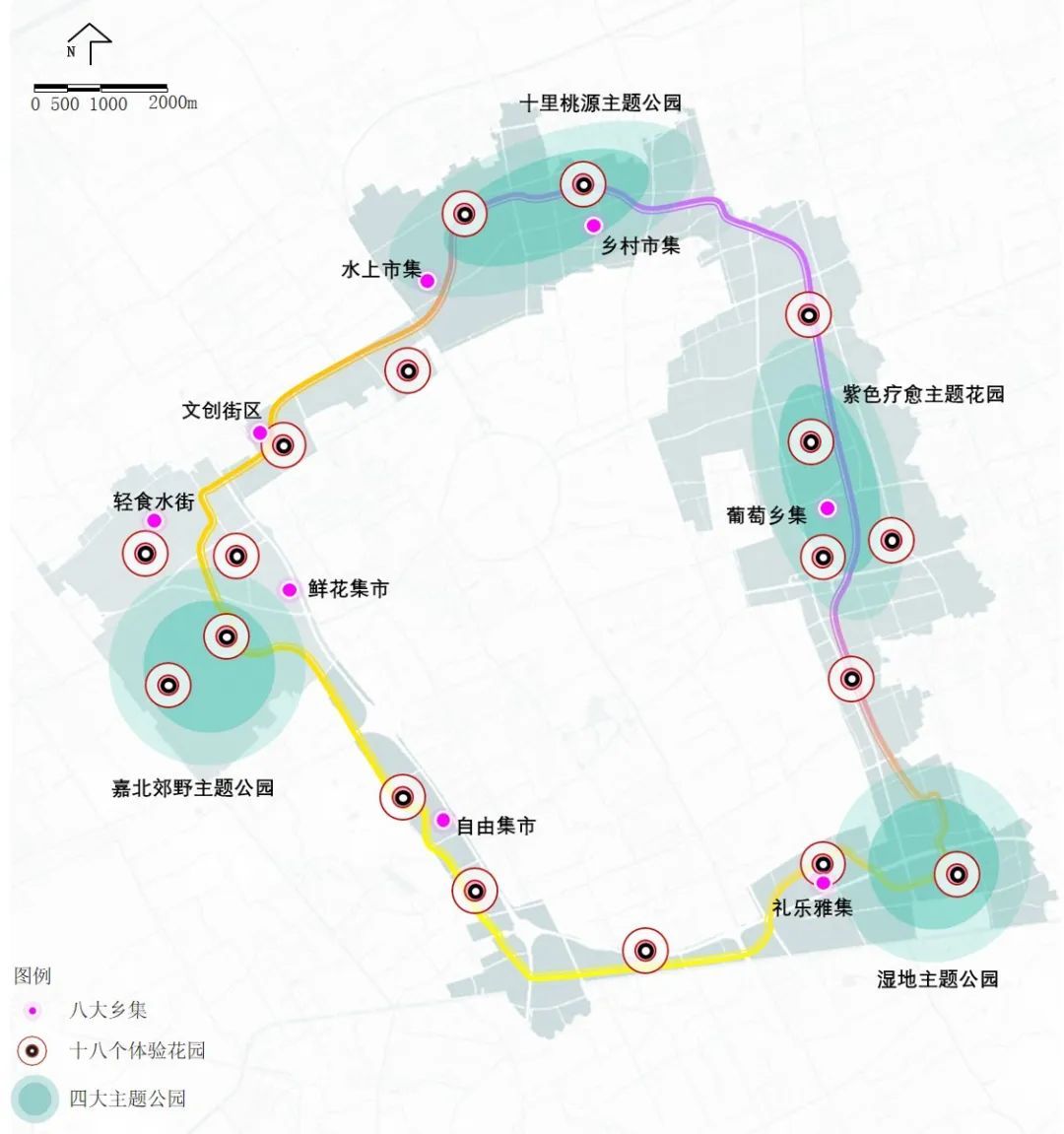 设计思路:方案在关注生产、生态、生活的同时,增加对原住民生计、场景生机和滋养生命的关注,以“生产、生活、生态、生计、生机、生息”的“六生”融合整合更多维度要素的规划理念,让绿环成为联系的纽带,成为推动嘉定创新发展的生态园地,实现可持续发展的生息之环。方案提出三大策略:一是自然友好、生态筑底。形成多条生态廊道,让小而零散的生态源地整合为大尺度的整体,重点建设修复与城市贯通的练祁河和紫气东来廊道两端的生态斑块,构建城绿友好的健康生态格局。二是汇聚流动、创新活力。提出“城市缝合织布功能、城市造血引领创新、梳理用地生态筑底”。在空间落位时兼具考量相关区段中保留村庄居民生计问题,引入特色化的公共服务资源,促进社会事业和产业经济的深度融合,让绿环成为体现平等互惠、生机勃勃、探索进取的可持续发展理念之环。三是场所共鸣,心灵滋养。面向未来城市生活,通过“场所共鸣、文化驿站、四时节令、嘉环公约”的嘉礼四大举措,再塑“疁城八景”,设置24节气主题的驿站,以多样的人文主题和活动场景滋养一方嘉人心灵。方案形成一环三片的空间结构,营建五个特色鲜明的主题分区。