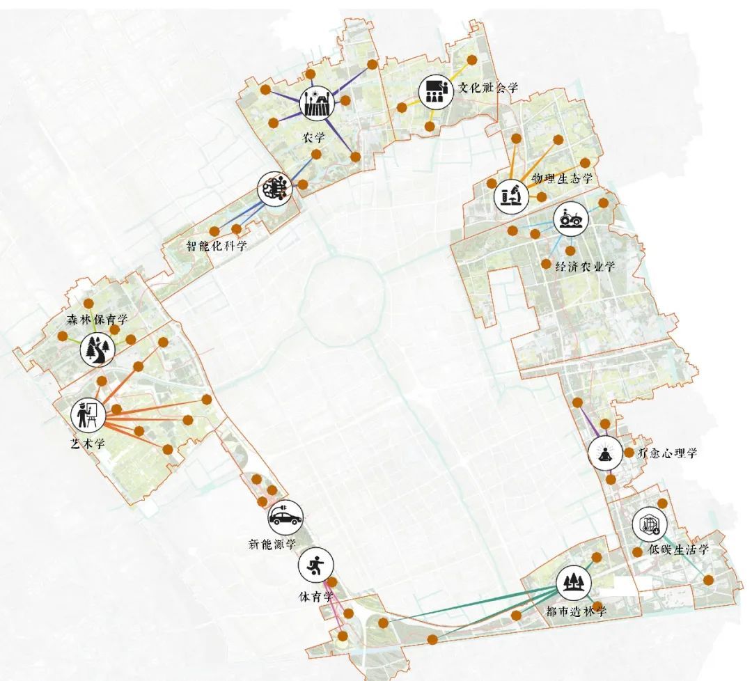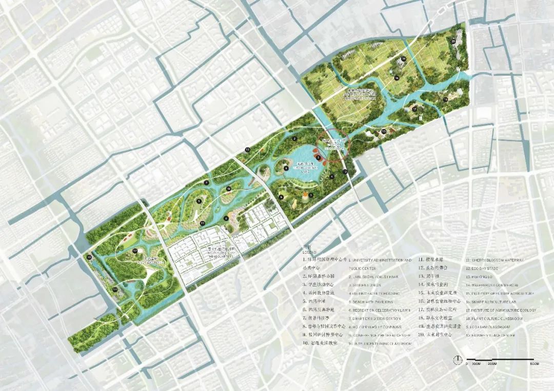 设计思路:方案提出“绿环校园”的设计概念,围绕整合破碎的林田水生态格局、基于人文嘉定服务城市需求、展现嘉定科技之城定位、加强构建新城品牌形象的目标,提出“容万物、生百慧”的“绿环校园”概念。方案以自然、人文、科技三大教育体现生态保育、运动游憩、低碳智慧的设计策略,通过十二个专业学系的设置将场地划分为十二个学科分区,构建生态环、学堂环、慢行环、水网环交织一体的绿环校园总体结构。方案提出五种典型生态空间策略,设立森林环,加强农林水复合利用,打造河岸林,推广生态低影响的新型农田生产模式,引导村庄建筑景观环境风貌品质提升,构建两级绿道、八个主题游线、水上游线、马拉松路线,策划节庆活动年历,为新城提供良好的游憩环境。