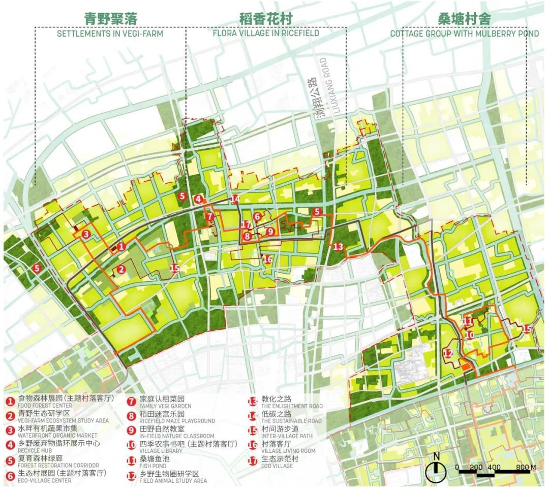 设计思路:方案以“教化的原野”为设计概念,承“教化”之精髓,应新时代之挑战,孕育、实践与拓展“教化之城”的多维度内涵,对教化进行生态化、低碳化、活力化、人文化的新诠释。方案提出三大规划策略,其一是提升生态价值,完善生态网络,打通断点,构建绿环与周边的多样连接方式,关注对现状人工环境的自然化改造,尤其是河道和林地生境的营建;其二是弘扬本地特色,形成教化之路、低碳之路两条环新城慢行贯通线;其三是推广低碳建设与产业,构建可循环产业链,提出建筑垃圾、工业场地及设施的再利用和生态村建设。总体形成六片大主题分区的空间结构。