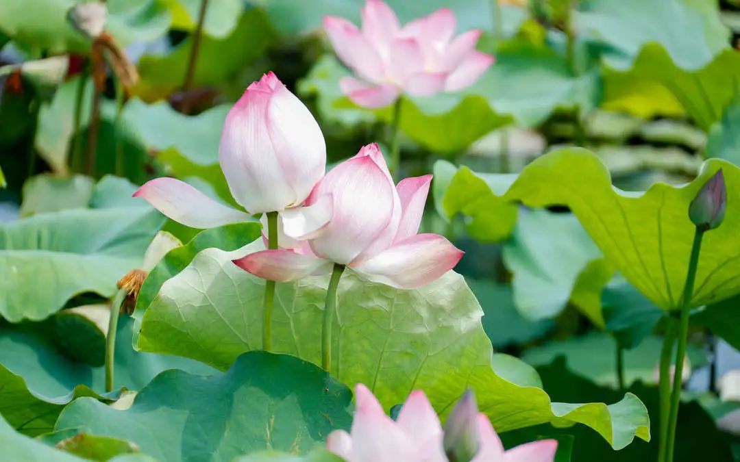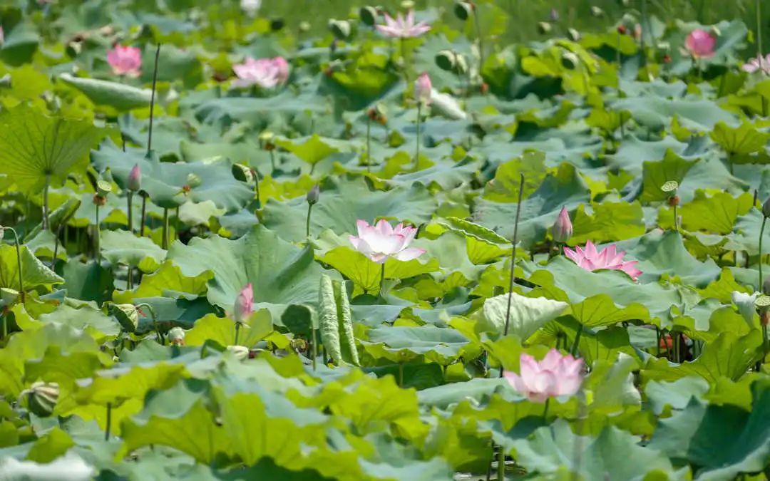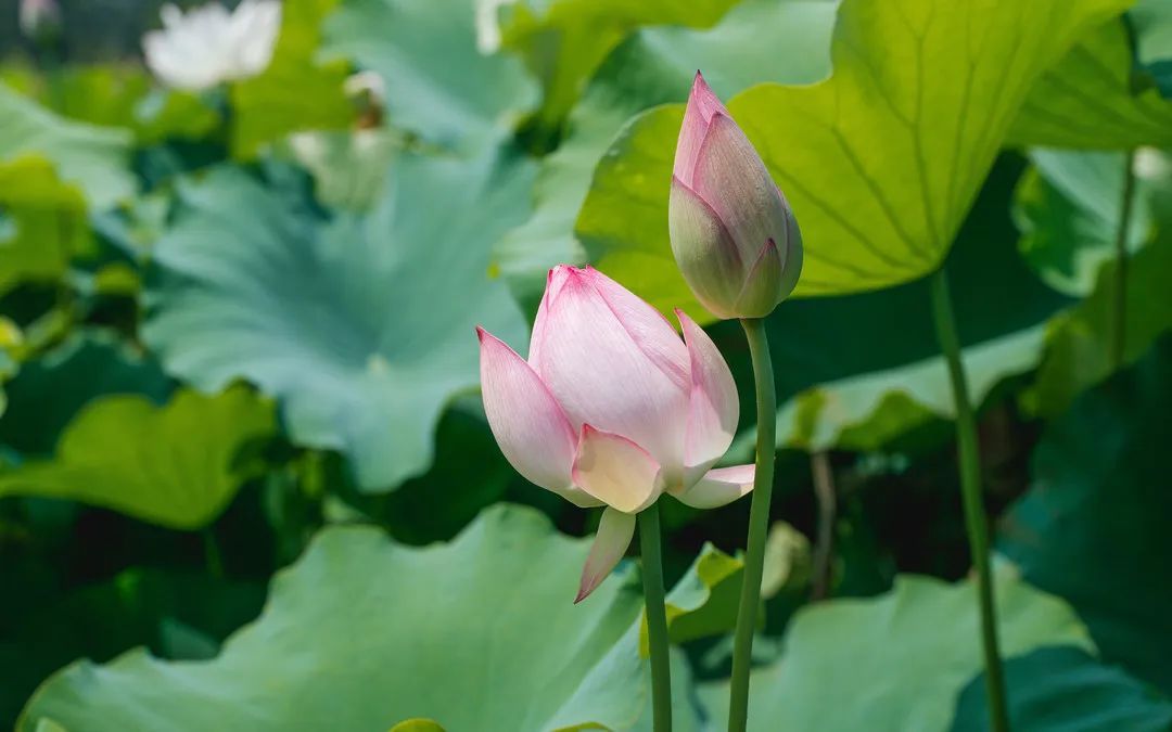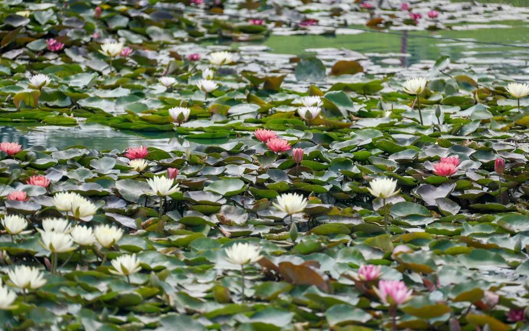 走进荷花博览园,首先映入眼帘的是一望无际的荷叶,随后便是千姿百态的荷花,簇簇盛放的荷花或粉嫩、或洁白,如亭亭玉立的少女,婀娜多姿、妩媚动人,在微风中摇曳生姿,把波光粼粼的水面点缀得灿烂夺目。