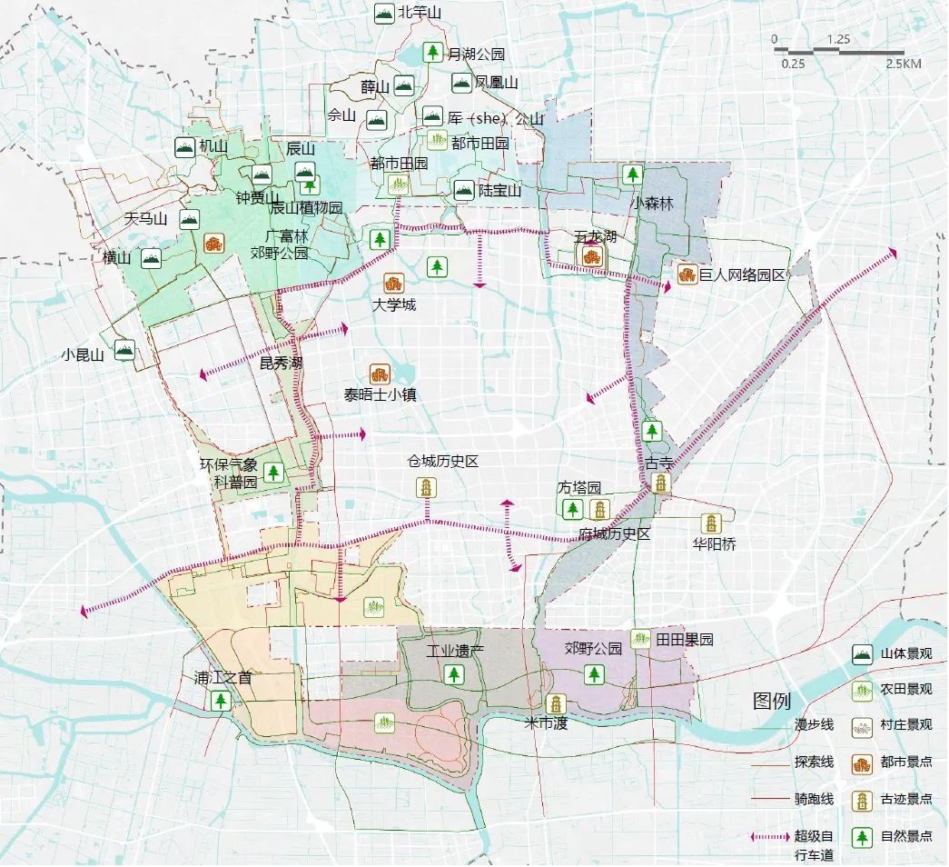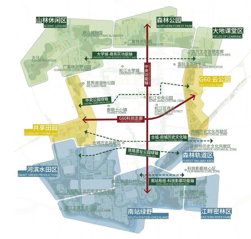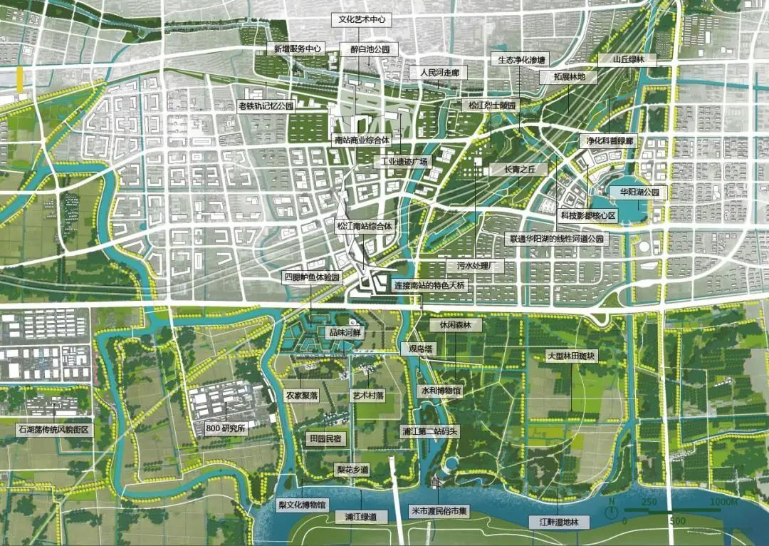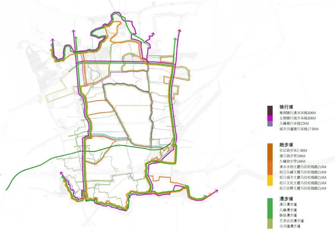 设计思路:方案将“以自然之道,养万物之生”作为规划理念,提出“山水像素,万物丰收”的目标定位,以期实现松江绿环的生命丰收、城市的生态丰收、人民的生活丰收。方案提出3大设计策略:塑绿,以“山水像素·林田语汇”为概念,通过“育林、理水、整田、掇山”,整合优化松江特有的生态像素斑块,塑造动态发展的“马赛克镶嵌式绿块”空间格局;城环,以“韧性守护·辐射渗透”为概念,打造九峰林道、浦江汀道、科创艺道,构建三层蓝绿辐射圈层,形成三类与绿环相互渗透的城市边界和九大生态空间,营造城中有环、环中有城的城环关系;赋能,以“多彩生活•创新激发”为概念,规划道路系统、慢行系统、游径游线、开放空间、公共服务设施,将村和路作为重要旅游休闲资源,打造便捷趣味的绿环,激发松江市民创新力。