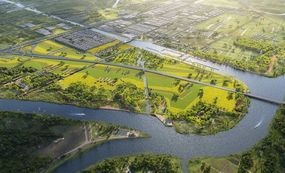 设计思路:方案以“城市起搏器 蓝绿聚能环”为设计概念,提出松江新城绿环具有生态之环、文脉之环、生产之环、发展之环四个层次,合在一起形成凝聚性的、反哺新城及周边的活力环。生态之环,通过景观重塑、农业增效、生境修复等实现线性廊道、林地空间和水系通廊的梳理修复。文脉之环,通过交通和水系串联历史文化兴趣点,形成有机的文脉体验环线。生产之环,通过打造高生态价值农田、高生产价值农田空间、游憩科教性农田等,打造生态稳定性强的特色农田系统。发展之环,通过对城市与绿环交界面进行引导,促进城绿融合。总体形成五大特色分区,构建三大慢行系统。