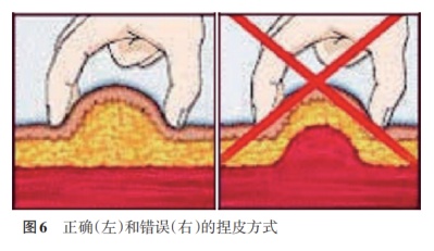 正确的捏皮方法: 用食指、拇指、中指三指进行捏皮使皮肤形成皮褶,不要满手抓;捏皮的力道要适中,不宜用力过大;捏皮后要在捏起的皮肤中央注射,90度进针,注射过程中不要松开皮褶。