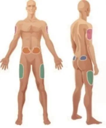 注射部位应选取皮下脂肪丰富的部位,常见的注射部位:人体适合注射胰岛素的部位是腹部、大腿外侧、上臂外侧和臀部外上侧。详见下图和文字说明: