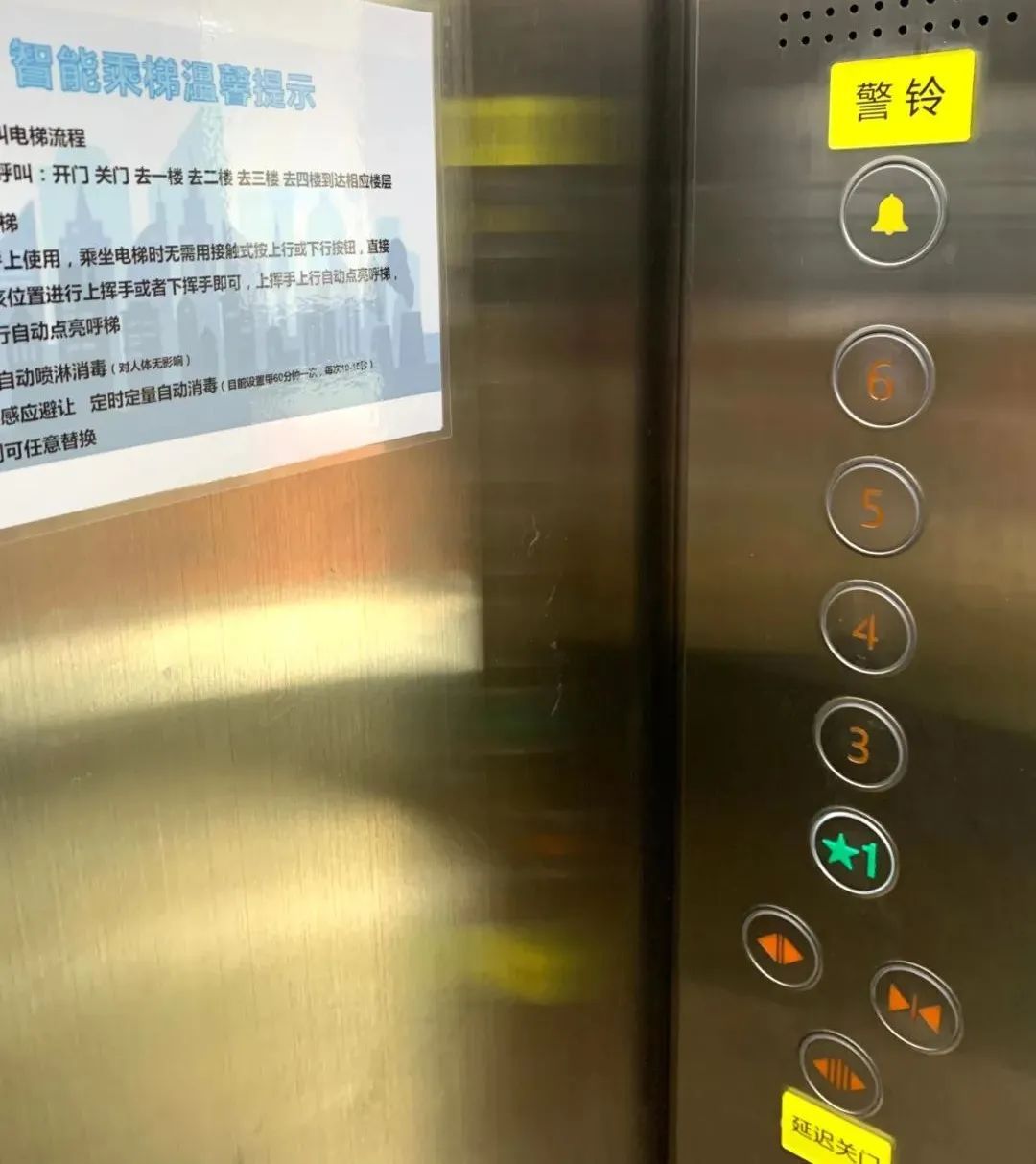 “我们现在设置的是每60分钟喷淋一次,一次10到15秒,使用的是低浓度酒精在电梯无人时进行雾状消毒”,工作人员介绍,“原先消毒剂直接喷洒电梯表面的做法,会腐蚀损坏电梯部件,特别是按键,现在就没这个顾虑了。”