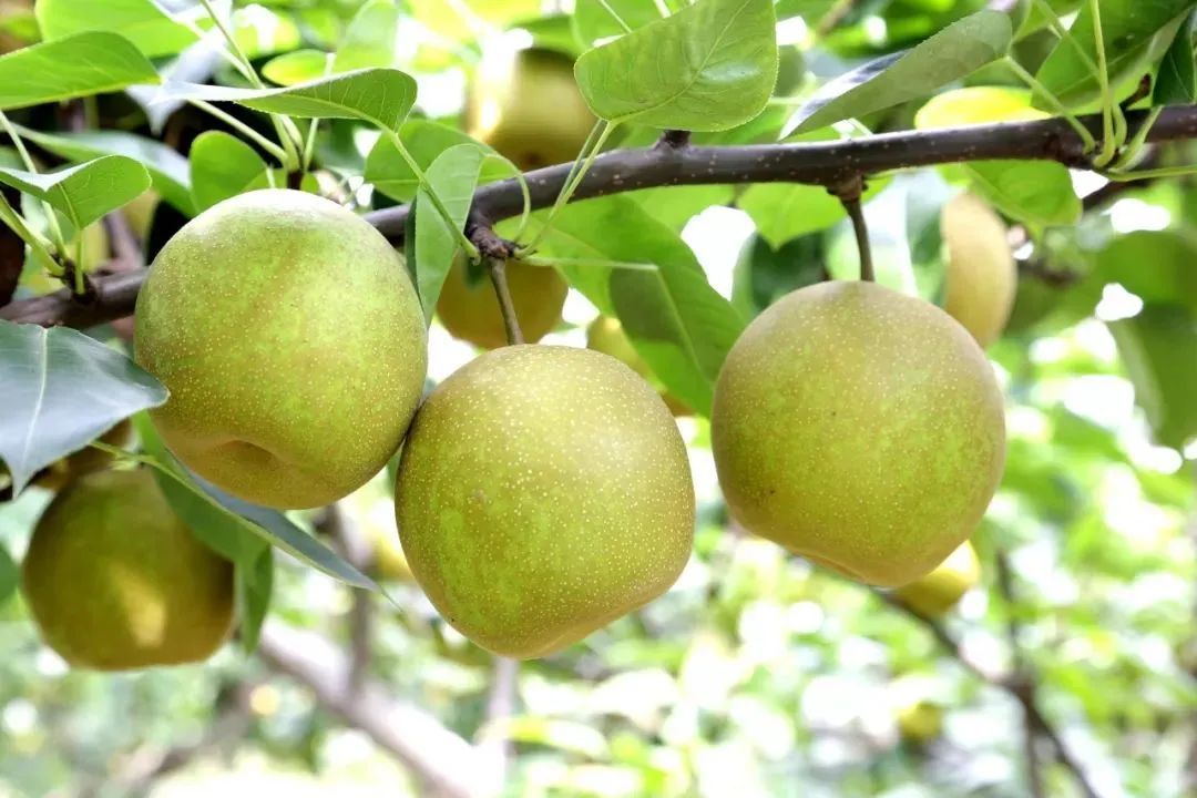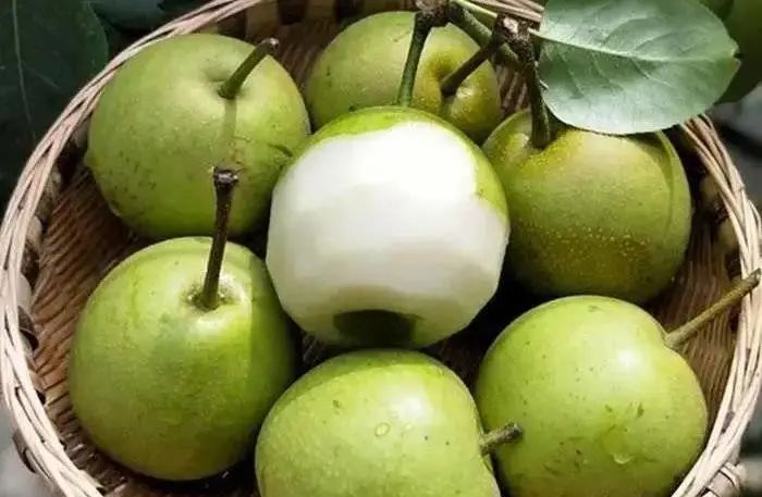 翠玉梨又名翡翠梨、苹果梨,梨果实圆形,果形端正,果顶稍平,果皮浅绿色,果面光洁具蜡质,果锈少,果点极小,果肉白色,肉质细嫩、化渣、汁多,口感脆甜,品质上乘。(七月上旬上市)