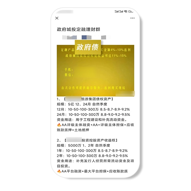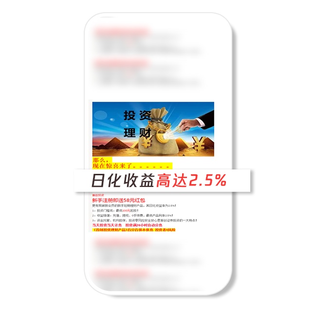 ● 微信公众帐号发布的内容中,禁止高收益理财欺诈内容,如推广不正常的高回报理财产品或导流欺诈项目。其中的“导流欺诈项目”通常表现为未明确日化或年化收益,但通过可疑的引导性内容,诱导用户添加个人微信或外链推广高收益理财产品。